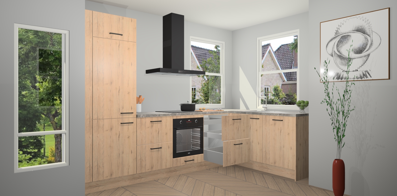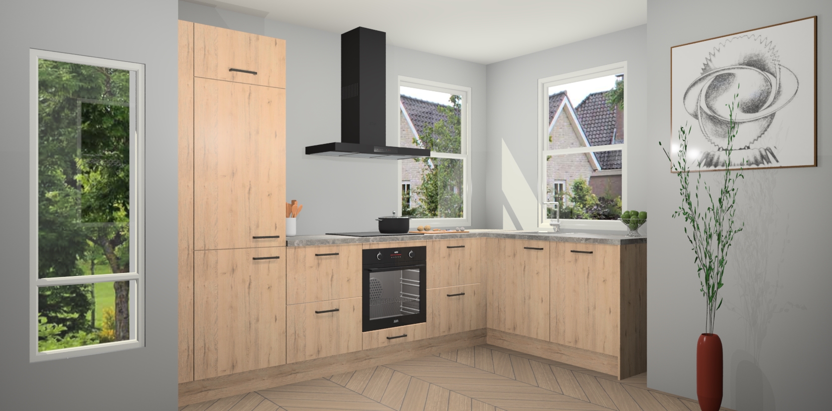 Wat maakt deze keuken zo bijzonder? Ten eerste geeft het houten werkblad uw ruimte een onmiskenbaar klassieke uitstraling. De natuurlijke afwerking roept warmte en elegantie op die nooit uit de mode zullen raken. Bovendien is het gemakkelijk schoon te houden en te onderhouden, zodat je er jarenlang plezier van kunt hebben. Als u op zoek bent naar extra gemak in uw keuken, dan heeft u bij het plaatsen van een bestelling bij ons ook de optie om uw toestellen te upgraden naar AEG-modellen - zo haalt u moderne innovatie van topmerken in apparatentechnologie rechtstreeks in huis.
