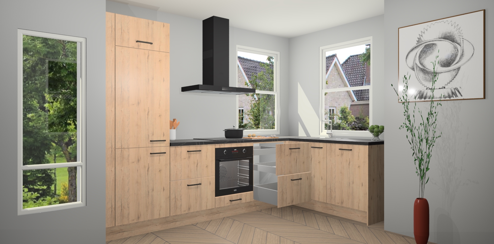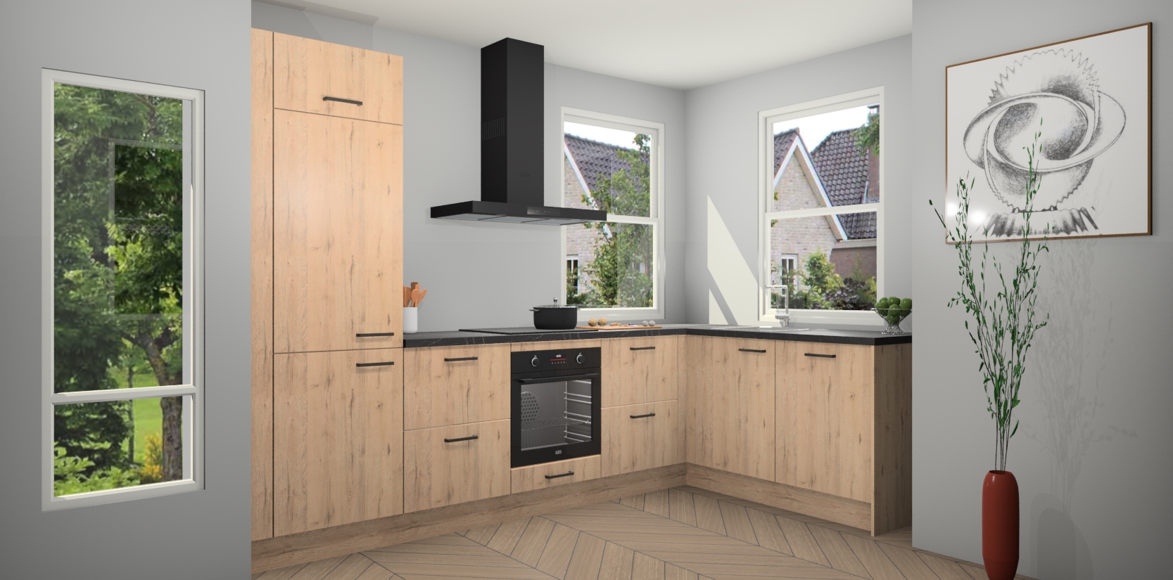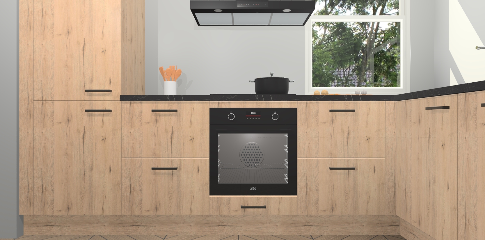 Wat maakt deze keuken zo bijzonder? Ten eerste geeft het houten werkblad uw ruimte een onmiskenbaar klassieke uitstraling. De natuurlijke afwerking roept warmte en elegantie op die nooit uit de mode zullen raken. Bovendien is het gemakkelijk schoon te houden en te onderhouden, zodat je er jarenlang plezier van kunt hebben. Als u op zoek bent naar extra gemak in uw keuken, dan heeft u bij het plaatsen van een bestelling bij ons ook de optie om uw toestellen te upgraden naar AEG-modellen - zo haalt u moderne innovatie van topmerken in apparatentechnologie rechtstreeks in huis.