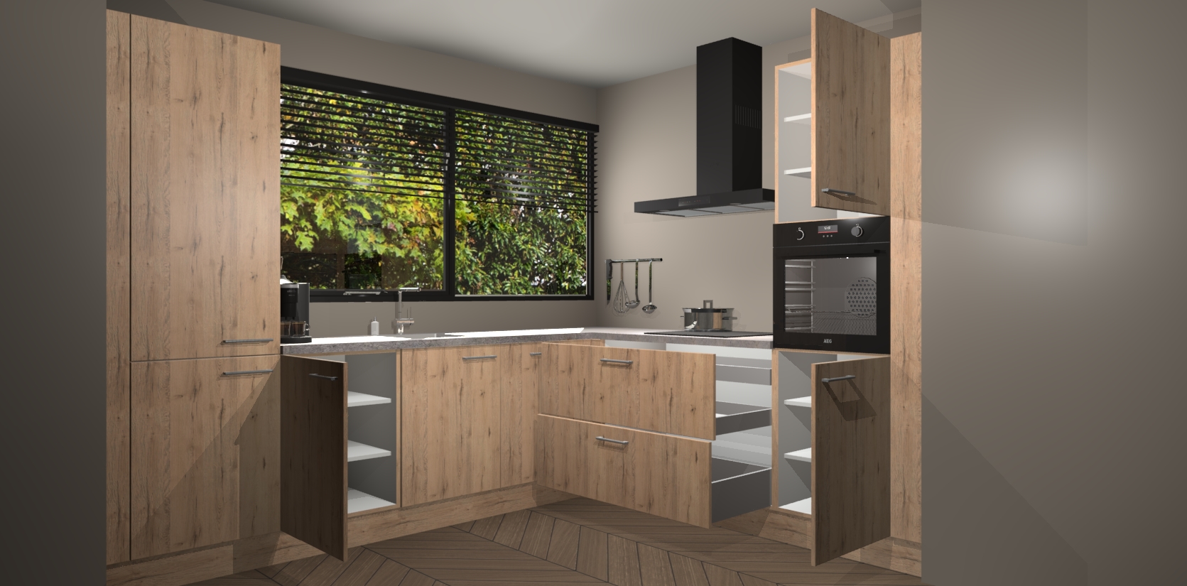 Met een modern, tijdloos design en ruime opslagruimte, zult u zich in no-time thuis voelen in uw nieuwe keuken. Uw leven wordt eenvoudiger met de soft-close deuren die voor het ultieme stille comfort zorgen - geen geluid dat u stoort terwijl u kookt. Ook is de keuken voorzien van 5 ingebouwde apparaten: een oven, inductie kookplaat, afzuigkap, vaatwasser en koelkast. Deze kunnen gemakkelijk na bestelling worden bijgewerkt naar AEG - waardoor uw luxe ervaring compleet is.