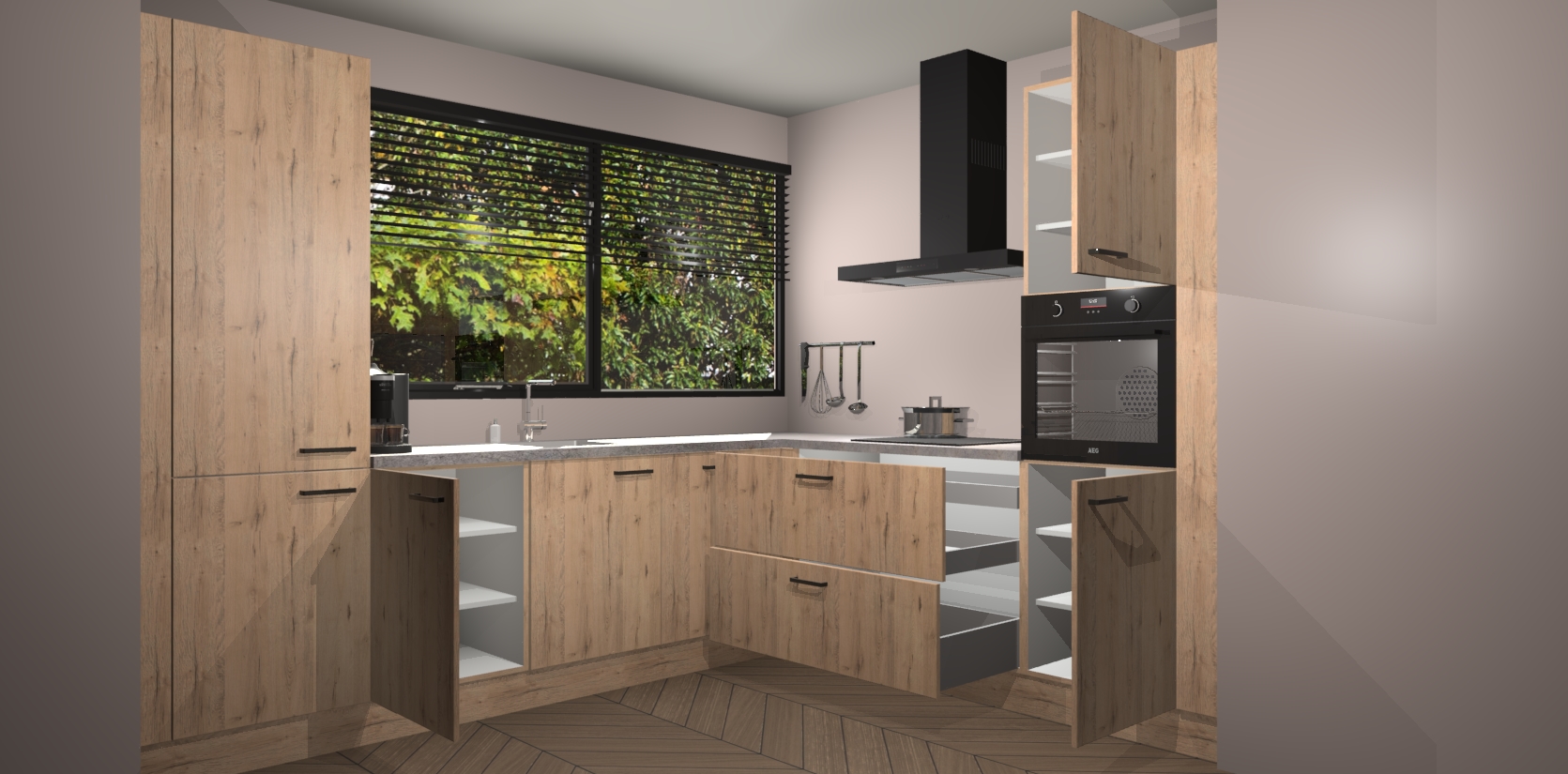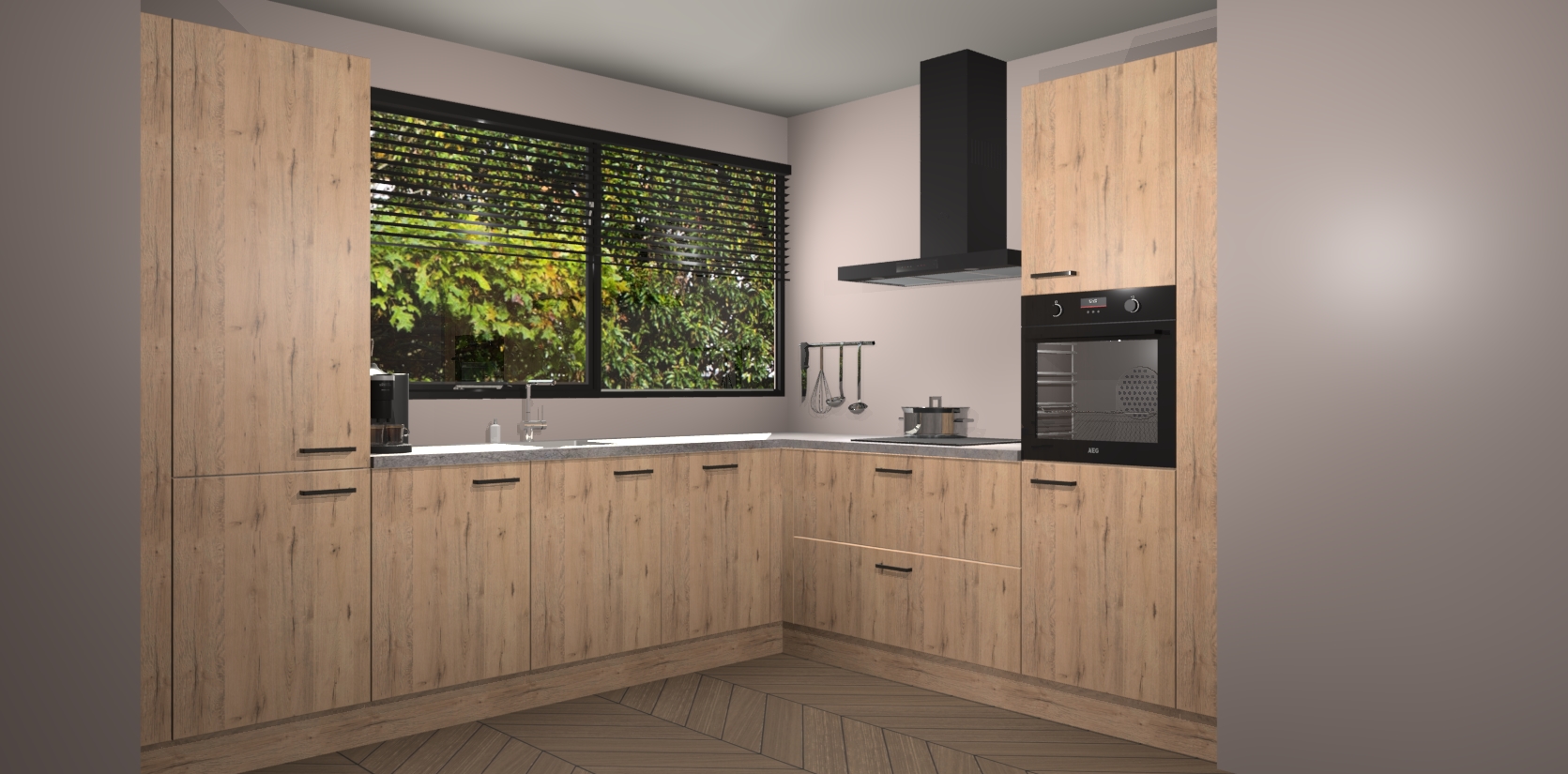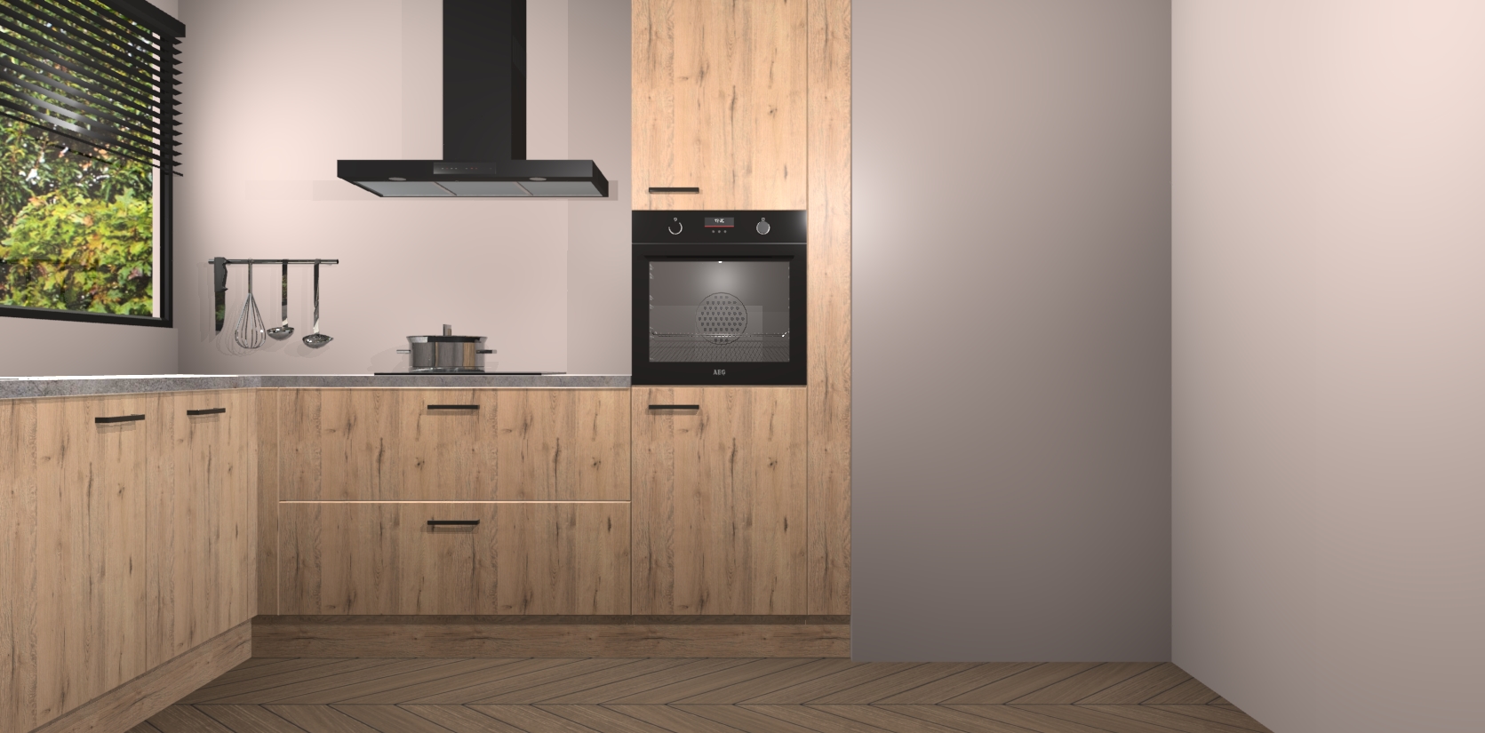 Met een modern, tijdloos design en ruime opslagruimte, zult u zich in no-time thuis voelen in uw nieuwe keuken. Uw leven wordt eenvoudiger met de soft-close deuren die voor het ultieme stille comfort zorgen - geen geluid dat u stoort terwijl u kookt. Ook is de keuken voorzien van 5 ingebouwde apparaten: een oven, inductie kookplaat, afzuigkap, vaatwasser en koelkast. Deze kunnen gemakkelijk na bestelling worden bijgewerkt naar AEG - waardoor uw luxe ervaring compleet is.
