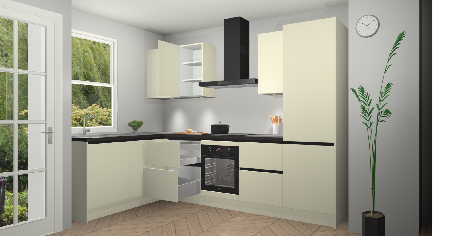 U hoeft zich ook geen zorgen te maken over een gebrek aan opbergruimte, want deze keuken heeft voldoende opbergmogelijkheden zowel boven als onder het aanrecht. Om het leven nog makkelijker te maken, wordt deze moderne hoekkeuken geleverd met 5 ingebouwde apparaten, waaronder een oven, inductiekookplaat, afzuigkap, vaatwasser en koelkast, zodat u in een mum van tijd klaar bent voor actie!