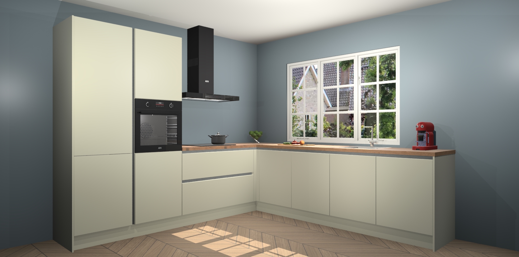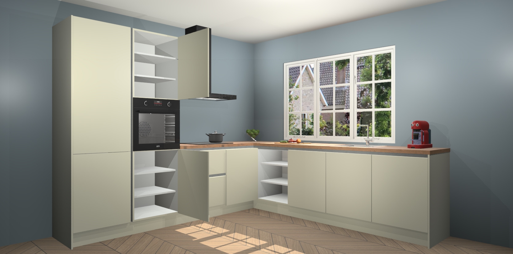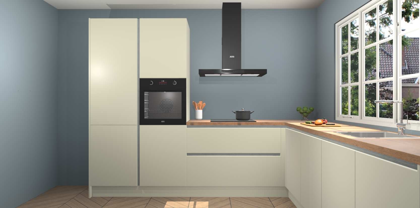 De keuken heeft veel opbergruimte, waardoor u alle ingrediënten gemakkelijk bereikbaar hebt staan. En daarnaast bevat deze volledig uitgeruste keuken ook 5 ingebouwde apparaten: een oven, inductiekookplaat, afzuigkap, vaatwasser en koelkast. Deze zijn heel eenvoudig na bestellen te upgraden naar AEG als u dit wilt. Bovendien zijn de softclose-kastdeuren ideaal; geef ze gewoon even een tikje en ze sluiten automatisch met geruisloze precisie.