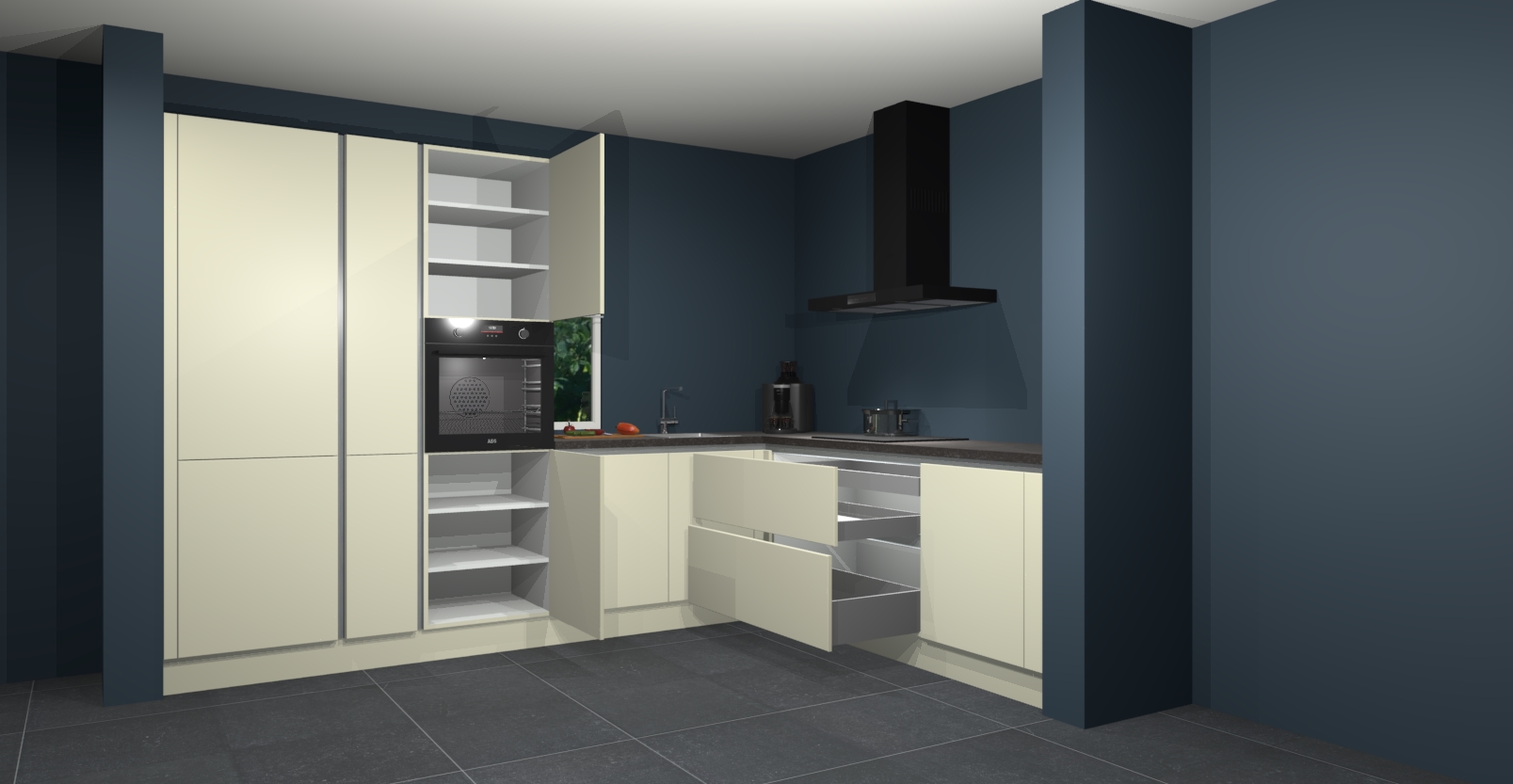 Met een modern, tijdloos design en ruime opslagruimte, zult u zich in no-time thuis voelen in uw nieuwe keuken. Uw leven wordt eenvoudiger met de soft-close deuren die voor het ultieme stille comfort zorgen - geen geluid dat u stoort terwijl u kookt. Ook is de keuken voorzien van 5 ingebouwde apparaten: een oven, inductie kookplaat, afzuigkap, vaatwasser en koelkast. Deze kunnen gemakkelijk na bestelling worden bijgewerkt naar AEG - waardoor uw luxe ervaring compleet is.