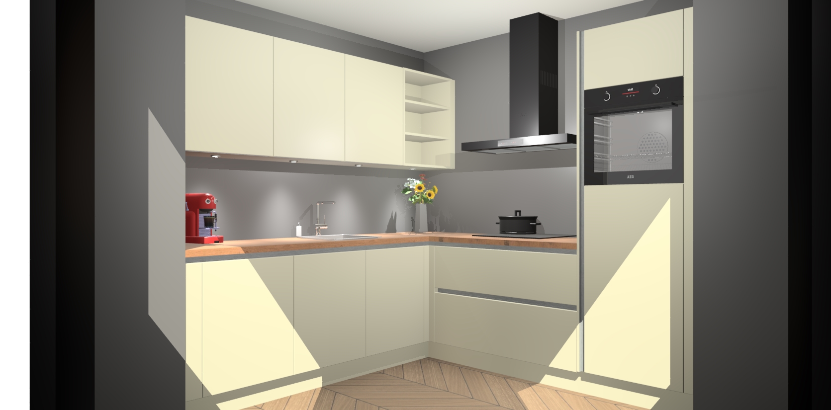 Met een modern, tijdloos design en ruime opslagruimte, zult u zich in no-time thuis voelen in uw nieuwe keuken. Uw leven wordt eenvoudiger met de soft-close deuren die voor het ultieme stille comfort zorgen - geen geluid dat u stoort terwijl u kookt. Ook is de keuken voorzien van 5 ingebouwde apparaten: een oven, inductie kookplaat, afzuigkap, vaatwasser en koelkast. Deze kunnen gemakkelijk na bestelling worden bijgewerkt naar AEG - waardoor uw luxe ervaring compleet is.