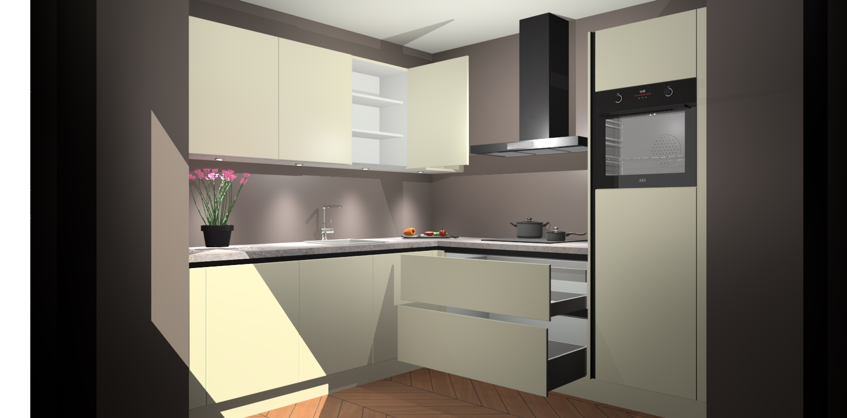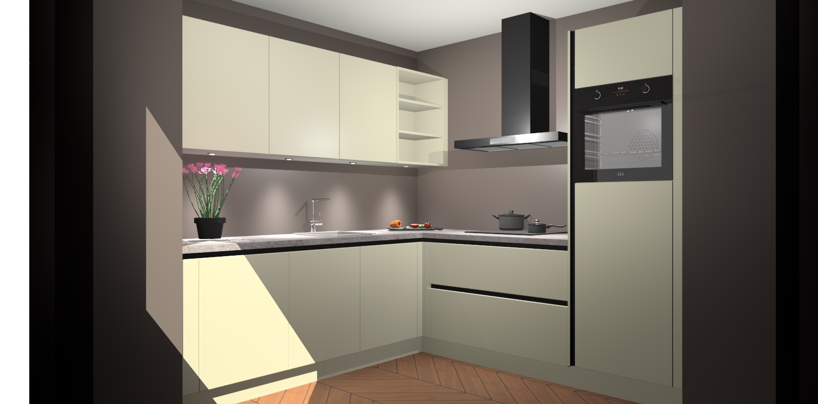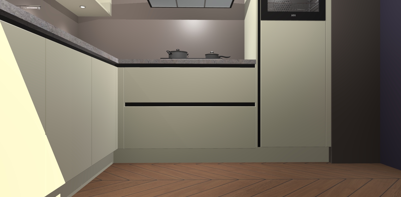 Met een modern, tijdloos design en ruime opslagruimte, zult u zich in no-time thuis voelen in uw nieuwe keuken. Uw leven wordt eenvoudiger met de soft-close deuren die voor het ultieme stille comfort zorgen - geen geluid dat u stoort terwijl u kookt. Ook is de keuken voorzien van 5 ingebouwde apparaten: een oven, inductie kookplaat, afzuigkap, vaatwasser en koelkast. Deze kunnen gemakkelijk na bestelling worden bijgewerkt naar AEG - waardoor uw luxe ervaring compleet is.
