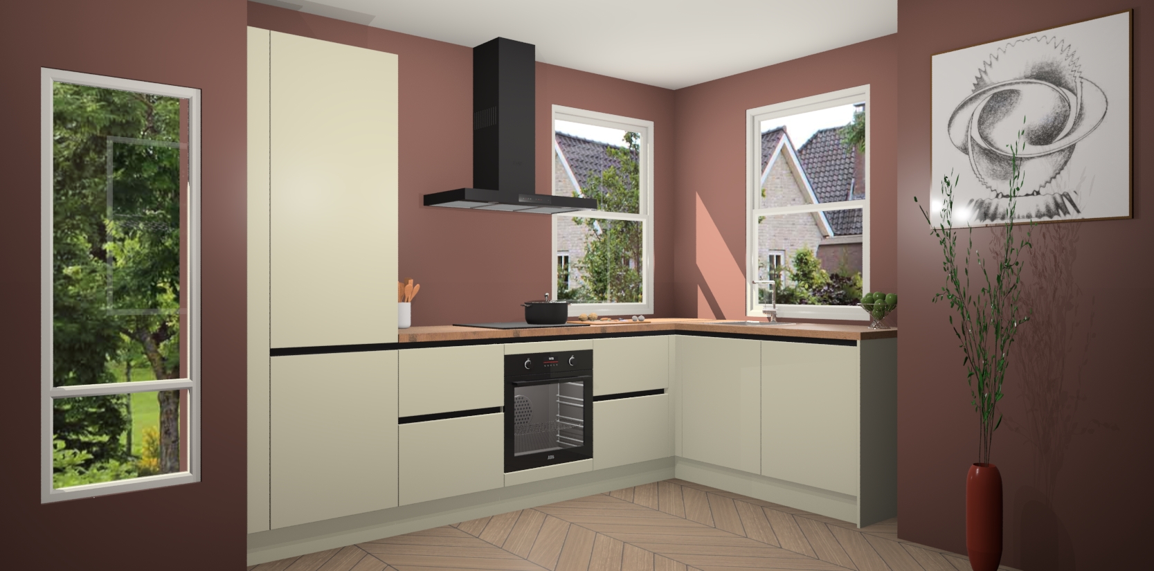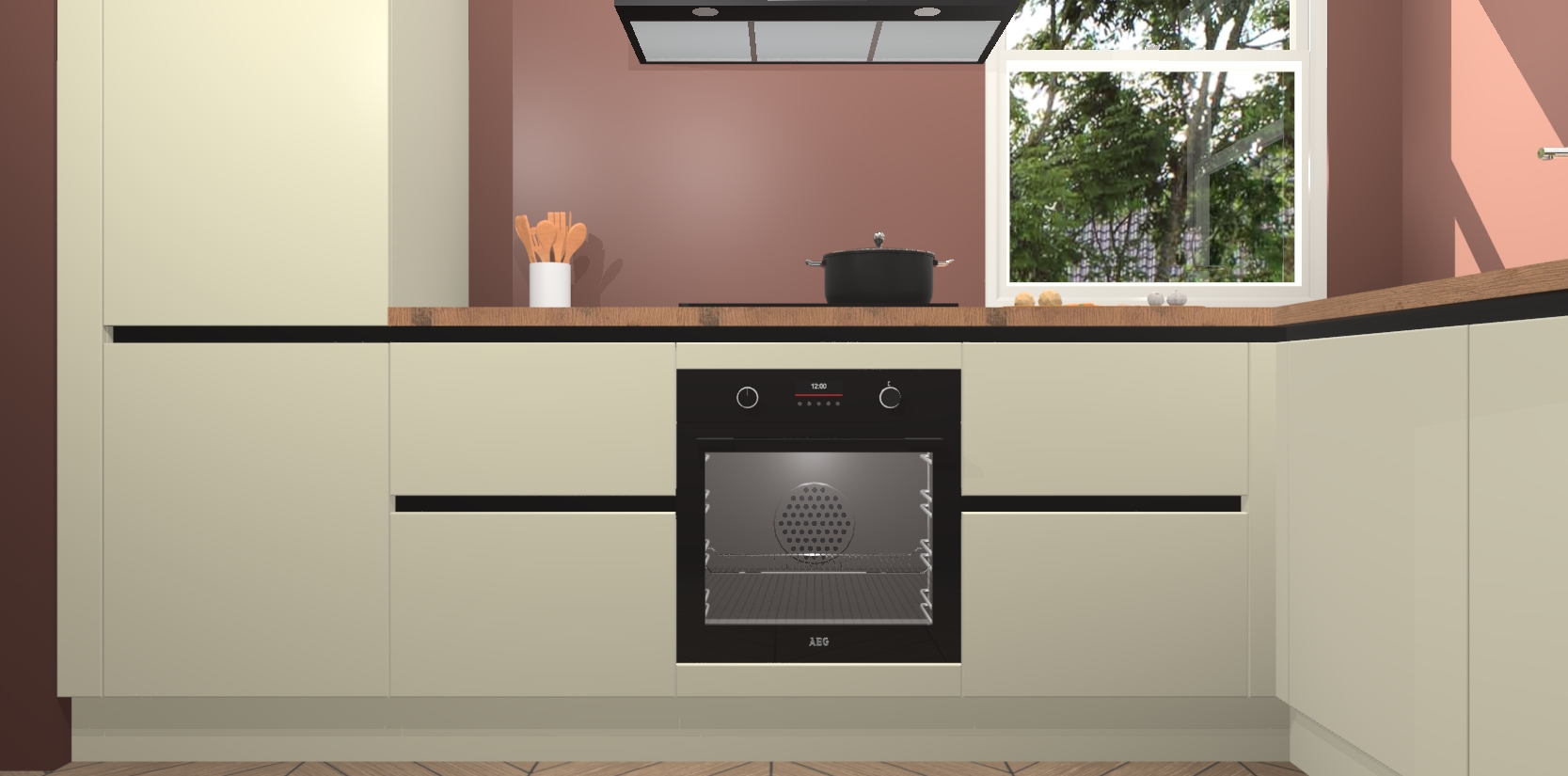 Wat maakt deze keuken zo bijzonder? Ten eerste geeft het houten werkblad uw ruimte een onmiskenbaar klassieke uitstraling. De natuurlijke afwerking roept warmte en elegantie op die nooit uit de mode zullen raken. Bovendien is het gemakkelijk schoon te houden en te onderhouden, zodat je er jarenlang plezier van kunt hebben. Als u op zoek bent naar extra gemak in uw keuken, dan heeft u bij het plaatsen van een bestelling bij ons ook de optie om uw toestellen te upgraden naar AEG-modellen - zo haalt u moderne innovatie van topmerken in apparatentechnologie rechtstreeks in huis.