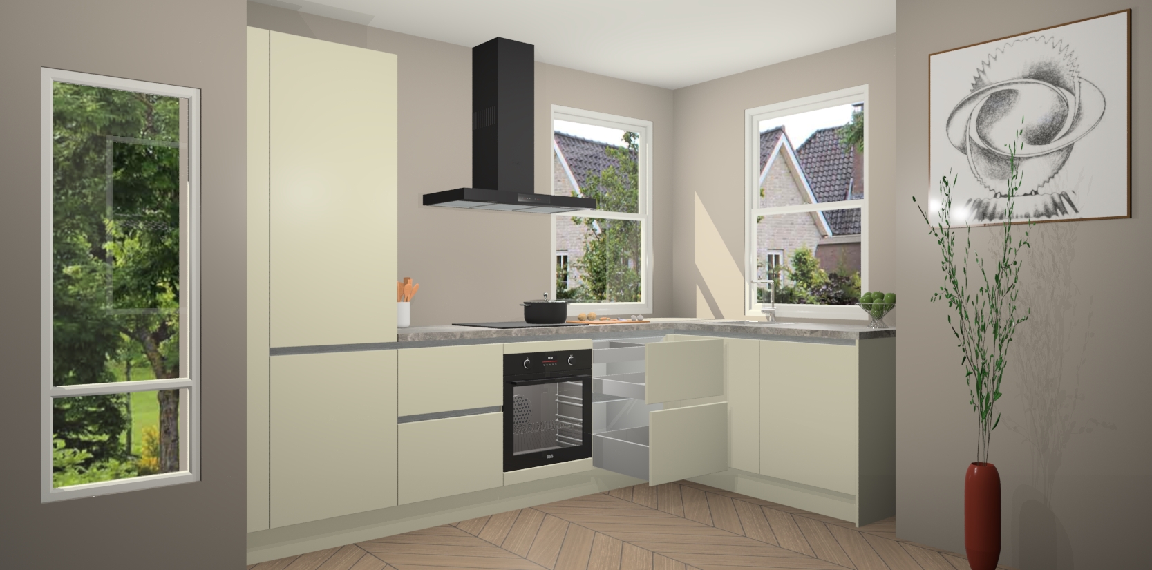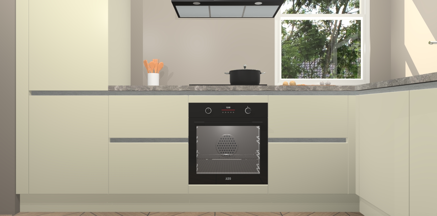 Wat maakt deze keuken zo bijzonder? Ten eerste geeft het houten werkblad uw ruimte een onmiskenbaar klassieke uitstraling. De natuurlijke afwerking roept warmte en elegantie op die nooit uit de mode zullen raken. Bovendien is het gemakkelijk schoon te houden en te onderhouden, zodat je er jarenlang plezier van kunt hebben. Als u op zoek bent naar extra gemak in uw keuken, dan heeft u bij het plaatsen van een bestelling bij ons ook de optie om uw toestellen te upgraden naar AEG-modellen - zo haalt u moderne innovatie van topmerken in apparatentechnologie rechtstreeks in huis.