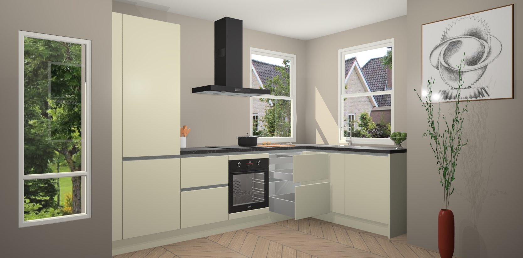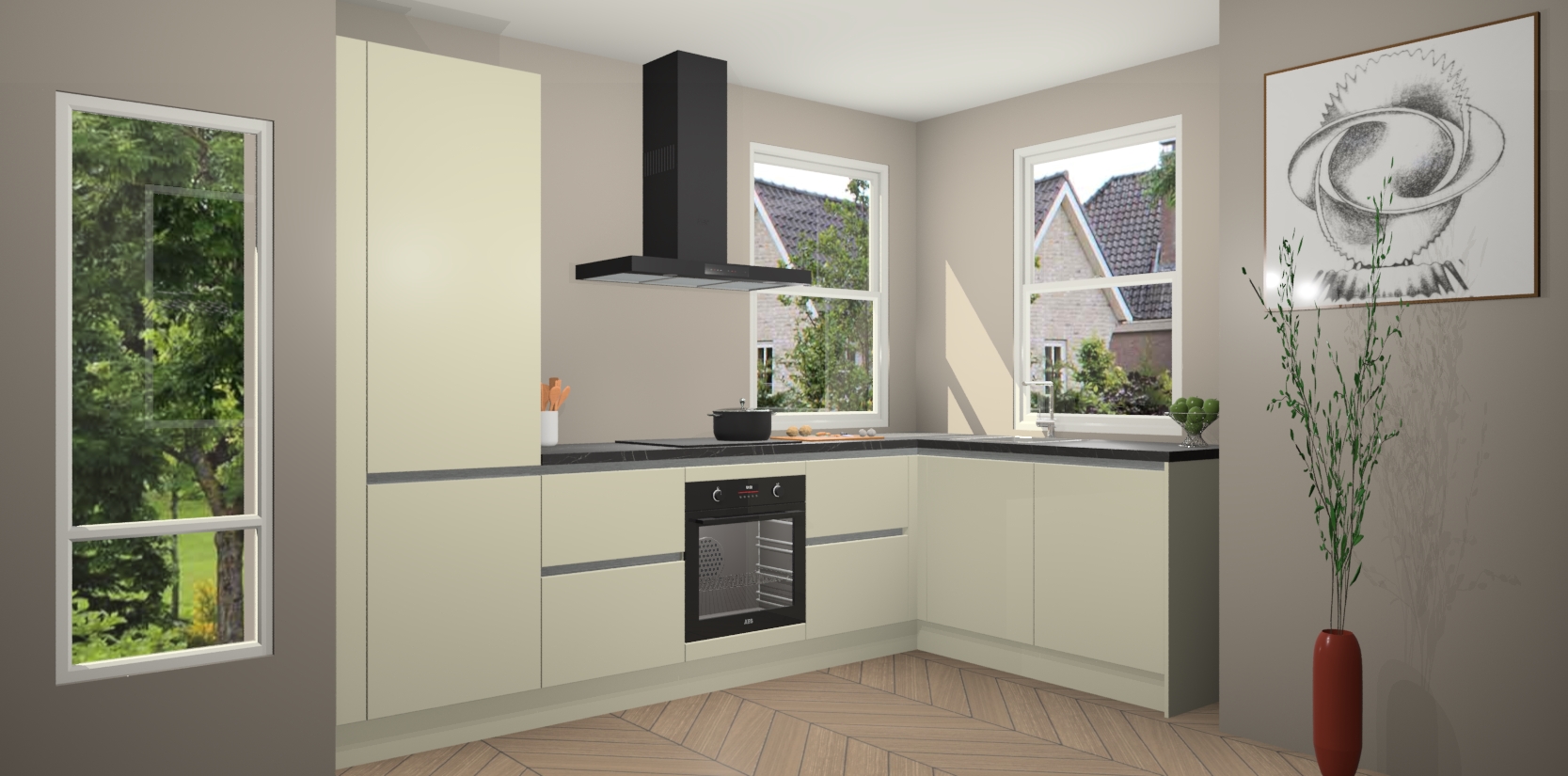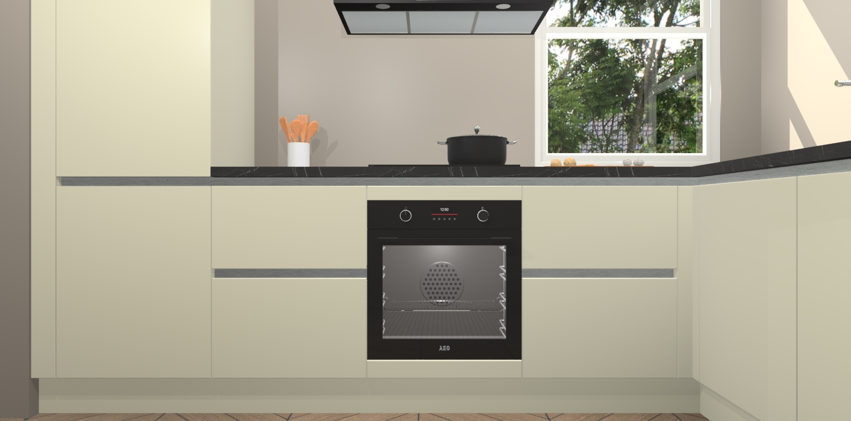 Wat maakt deze keuken zo bijzonder? Ten eerste geeft het houten werkblad uw ruimte een onmiskenbaar klassieke uitstraling. De natuurlijke afwerking roept warmte en elegantie op die nooit uit de mode zullen raken. Bovendien is het gemakkelijk schoon te houden en te onderhouden, zodat je er jarenlang plezier van kunt hebben. Als u op zoek bent naar extra gemak in uw keuken, dan heeft u bij het plaatsen van een bestelling bij ons ook de optie om uw toestellen te upgraden naar AEG-modellen - zo haalt u moderne innovatie van topmerken in apparatentechnologie rechtstreeks in huis.