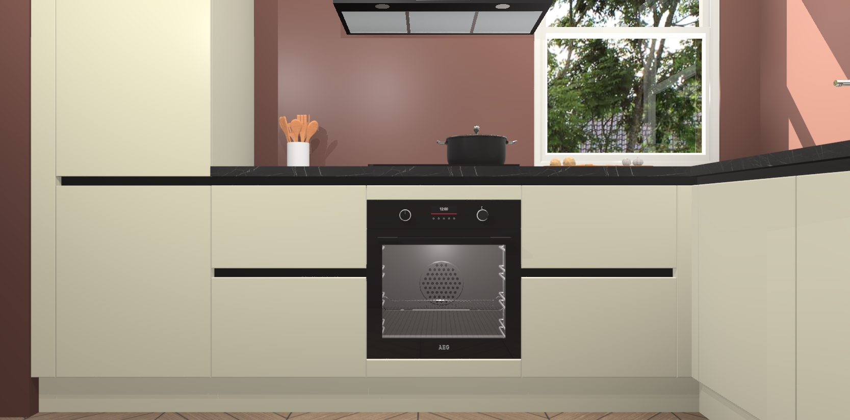 Wat maakt deze keuken zo bijzonder? Ten eerste geeft het houten werkblad uw ruimte een onmiskenbaar klassieke uitstraling. De natuurlijke afwerking roept warmte en elegantie op die nooit uit de mode zullen raken. Bovendien is het gemakkelijk schoon te houden en te onderhouden, zodat je er jarenlang plezier van kunt hebben. Als u op zoek bent naar extra gemak in uw keuken, dan heeft u bij het plaatsen van een bestelling bij ons ook de optie om uw toestellen te upgraden naar AEG-modellen - zo haalt u moderne innovatie van topmerken in apparatentechnologie rechtstreeks in huis.