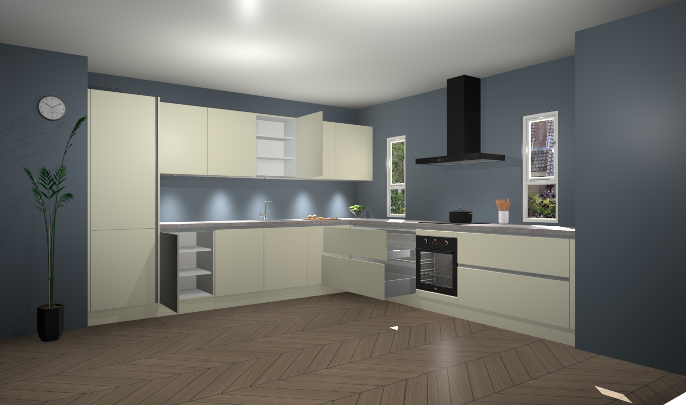 De magnolia greeploze keuken is een ideale hoekkeuken en heeft alle functies en apparatuur die u maar nodig kunt hebben. Bij de bestelling krijgt u een oven, inductiekookplaat, afzuigkap, vaatwasser en koelkast - deze kunnen desgewenst eenvoudig worden uitgebreid naar AEG na bestellen. Elke kast wordt ook voor gemonteerd geleverd met soft close deuren die jarenlang gebruik beloven. Stelt u zich voor dat u geen gedoe heeft met vervelende montage - vanaf het moment dat u uw bestelling plaats, duurt het slechts 7 weken voor het bij u thuis geleverd wordt.