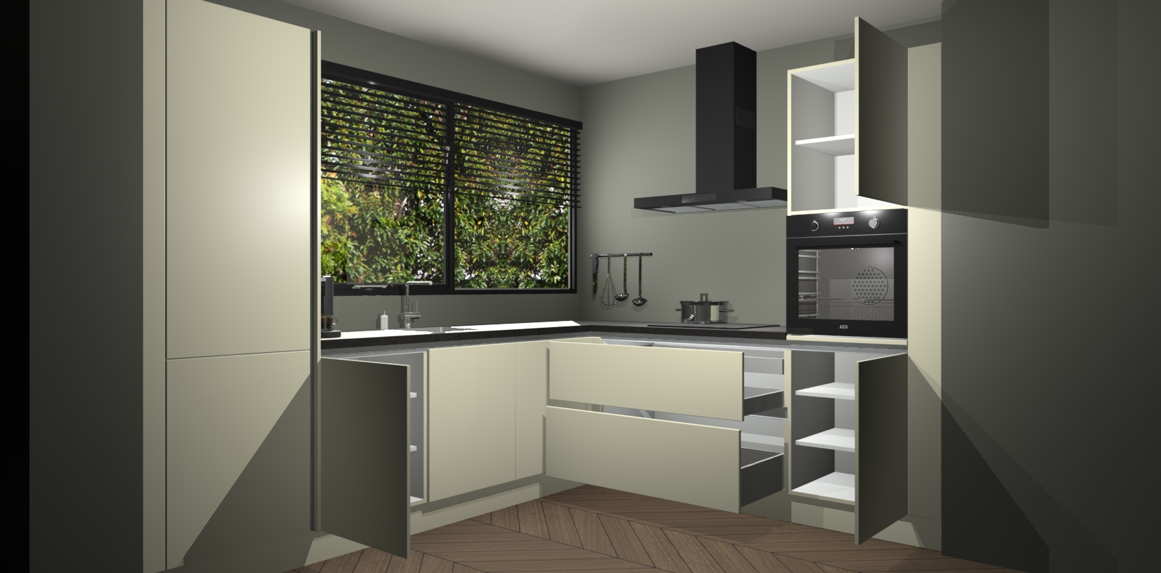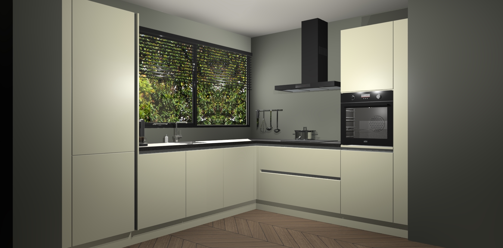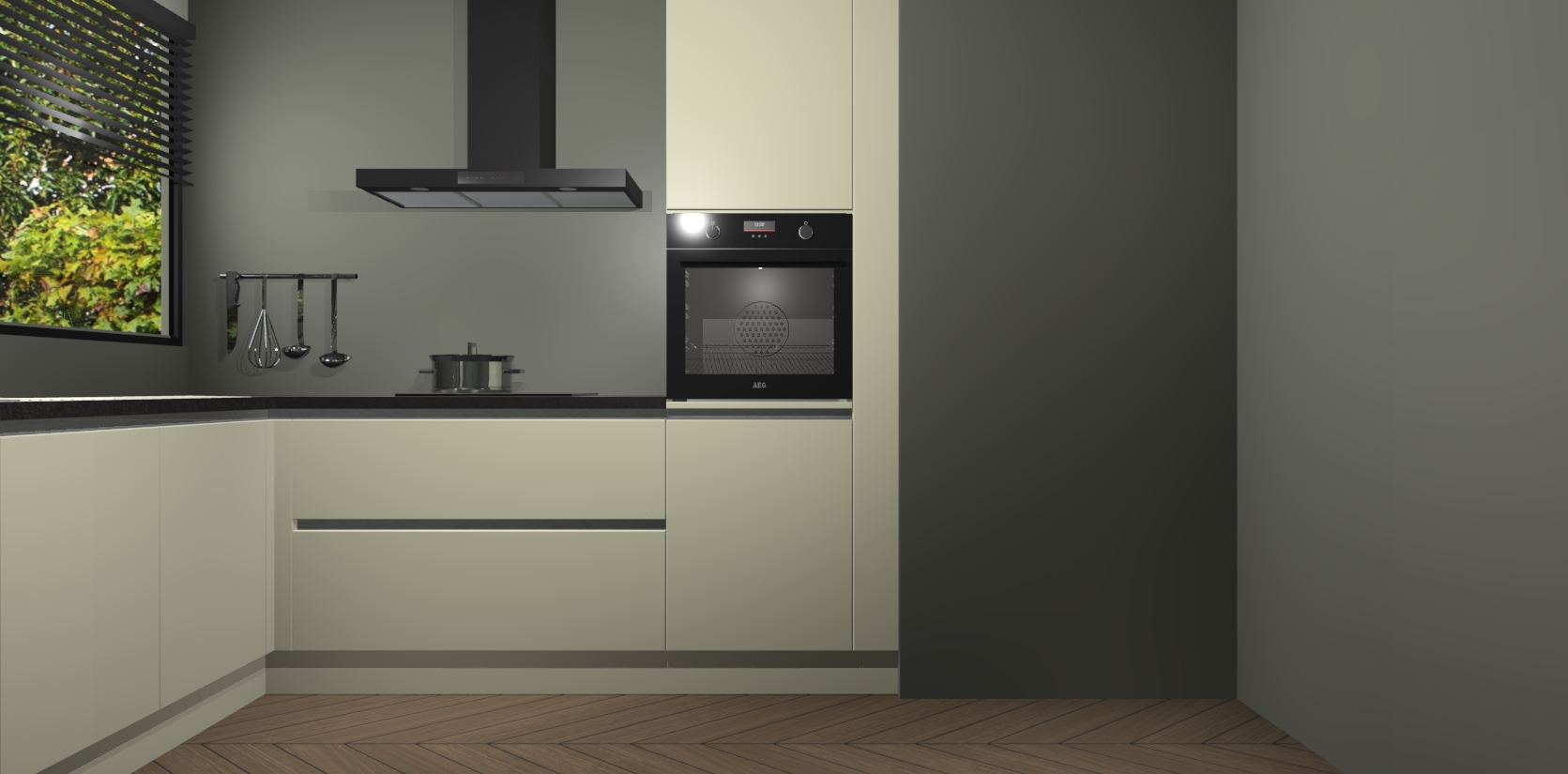 Met een modern, tijdloos design en ruime opslagruimte, zult u zich in no-time thuis voelen in uw nieuwe keuken. Uw leven wordt eenvoudiger met de soft-close deuren die voor het ultieme stille comfort zorgen - geen geluid dat u stoort terwijl u kookt. Ook is de keuken voorzien van 5 ingebouwde apparaten: een oven, inductie kookplaat, afzuigkap, vaatwasser en koelkast. Deze kunnen gemakkelijk na bestelling worden bijgewerkt naar AEG - waardoor uw luxe ervaring compleet is.
