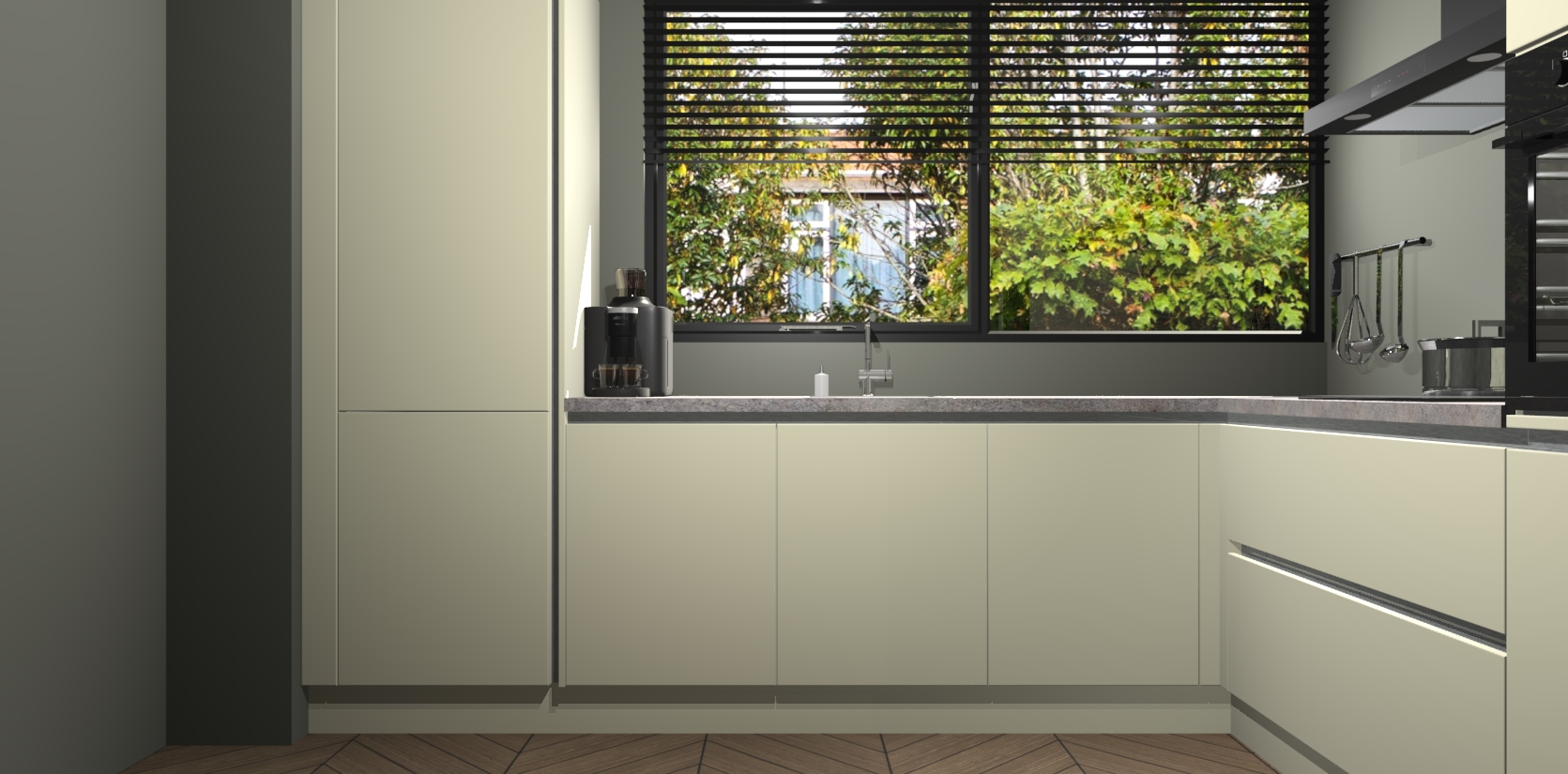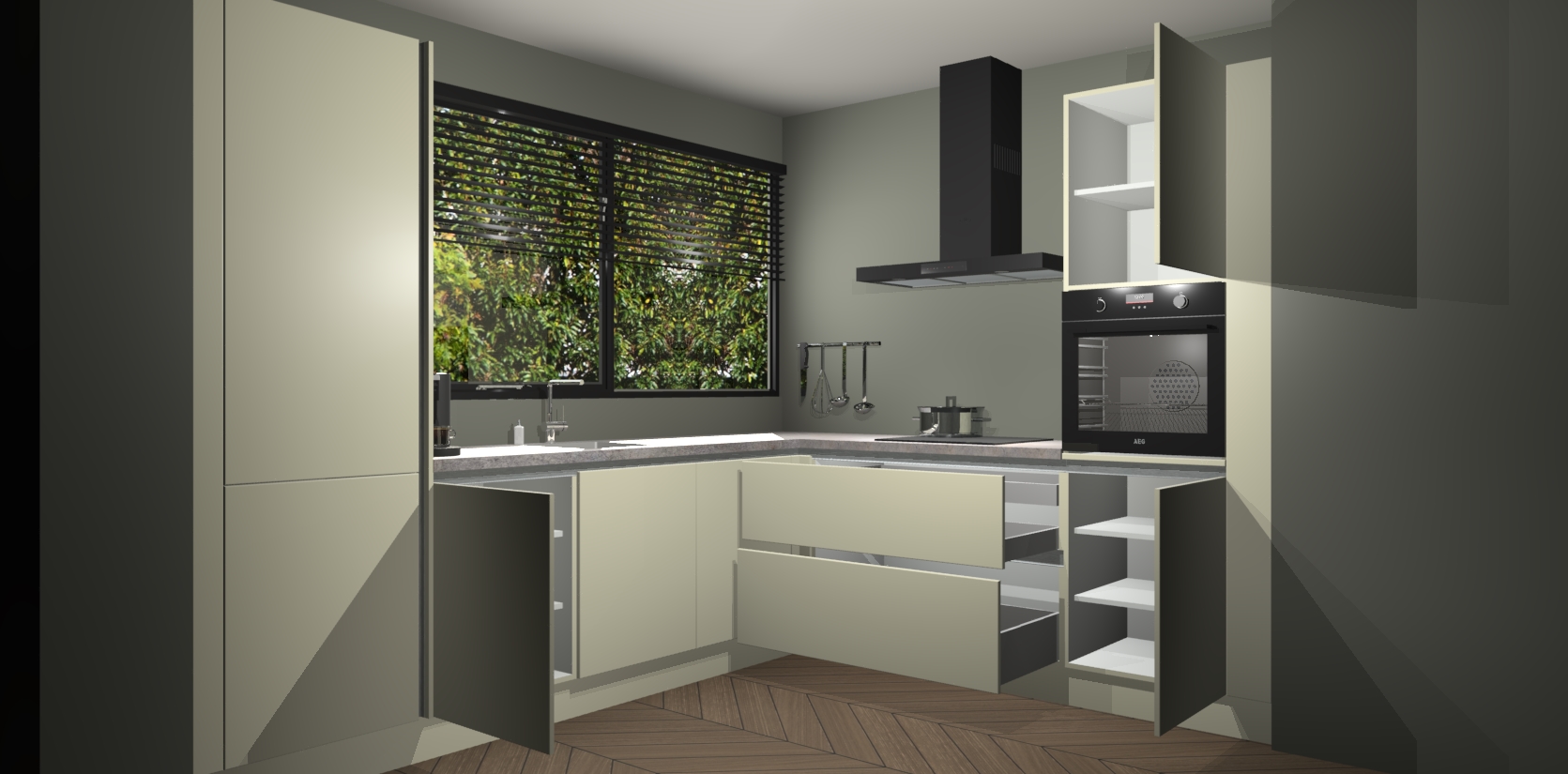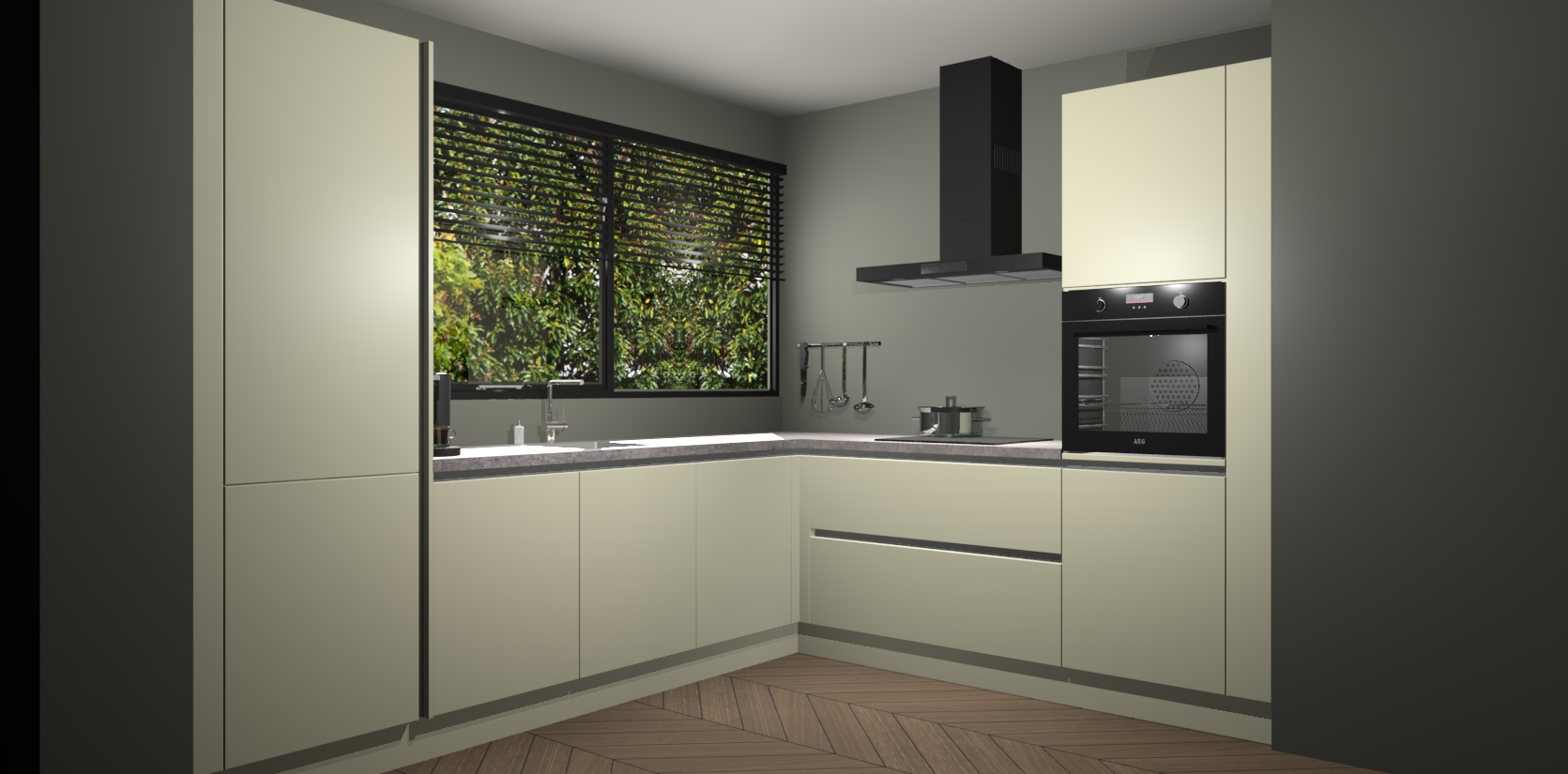 Met een modern, tijdloos design en ruime opslagruimte, zult u zich in no-time thuis voelen in uw nieuwe keuken. Uw leven wordt eenvoudiger met de soft-close deuren die voor het ultieme stille comfort zorgen - geen geluid dat u stoort terwijl u kookt. Ook is de keuken voorzien van 5 ingebouwde apparaten: een oven, inductie kookplaat, afzuigkap, vaatwasser en koelkast. Deze kunnen gemakkelijk na bestelling worden bijgewerkt naar AEG - waardoor uw luxe ervaring compleet is.