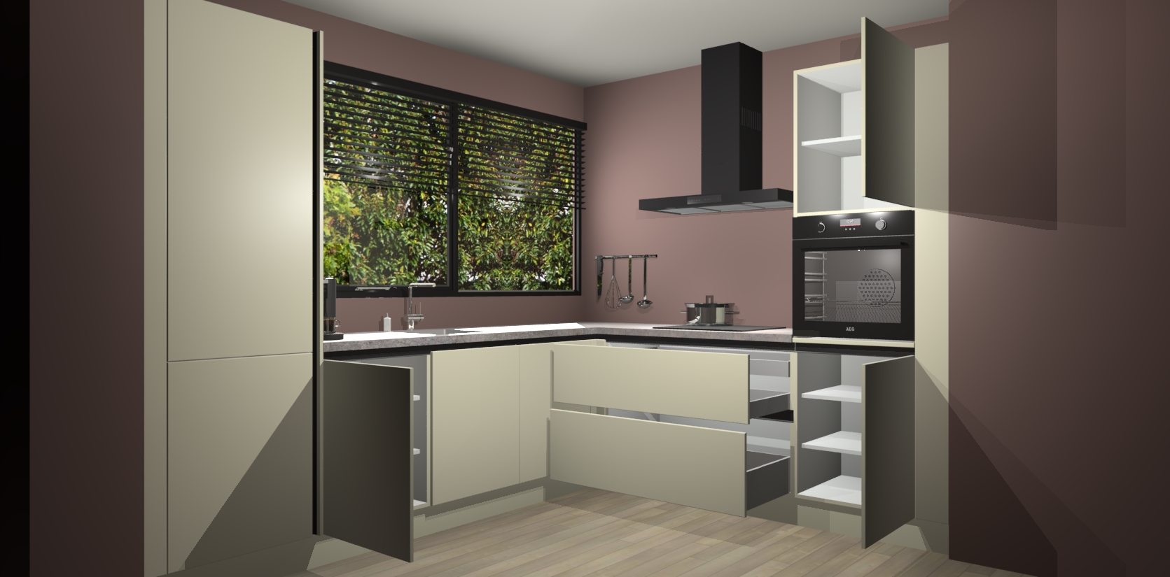 Met een modern, tijdloos design en ruime opslagruimte, zult u zich in no-time thuis voelen in uw nieuwe keuken. Uw leven wordt eenvoudiger met de soft-close deuren die voor het ultieme stille comfort zorgen - geen geluid dat u stoort terwijl u kookt. Ook is de keuken voorzien van 5 ingebouwde apparaten: een oven, inductie kookplaat, afzuigkap, vaatwasser en koelkast. Deze kunnen gemakkelijk na bestelling worden bijgewerkt naar AEG - waardoor uw luxe ervaring compleet is.
