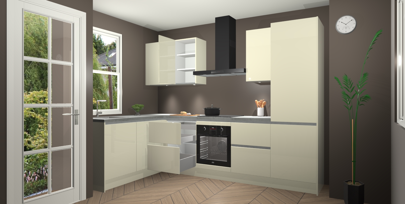 U hoeft zich ook geen zorgen te maken over een gebrek aan opbergruimte, want deze keuken heeft voldoende opbergmogelijkheden zowel boven als onder het aanrecht. Om het leven nog makkelijker te maken, wordt deze moderne hoekkeuken geleverd met 5 ingebouwde apparaten, waaronder een oven, inductiekookplaat, afzuigkap, vaatwasser en koelkast, zodat u in een mum van tijd klaar bent voor actie!