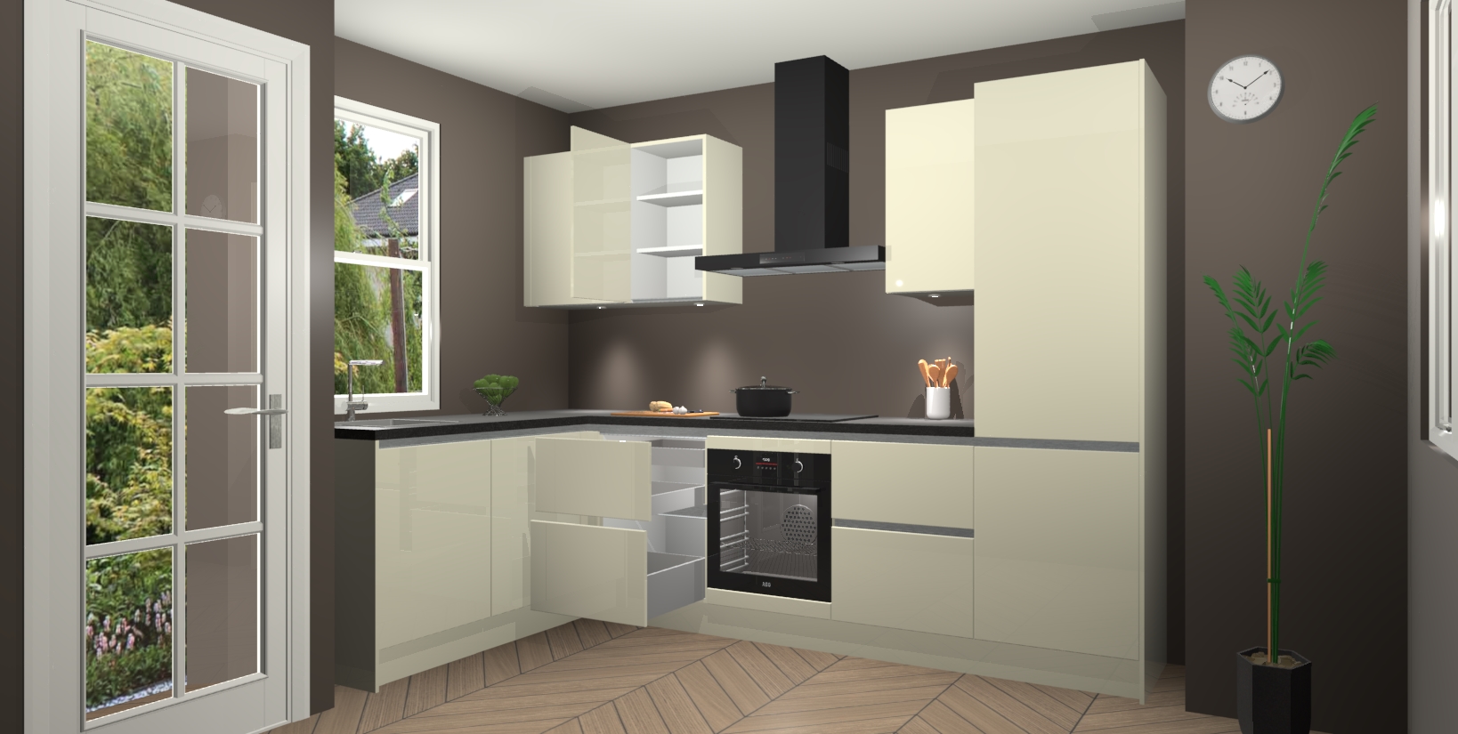 U hoeft zich ook geen zorgen te maken over een gebrek aan opbergruimte, want deze keuken heeft voldoende opbergmogelijkheden zowel boven als onder het aanrecht. Om het leven nog makkelijker te maken, wordt deze moderne hoekkeuken geleverd met 5 ingebouwde apparaten, waaronder een oven, inductiekookplaat, afzuigkap, vaatwasser en koelkast, zodat u in een mum van tijd klaar bent voor actie!