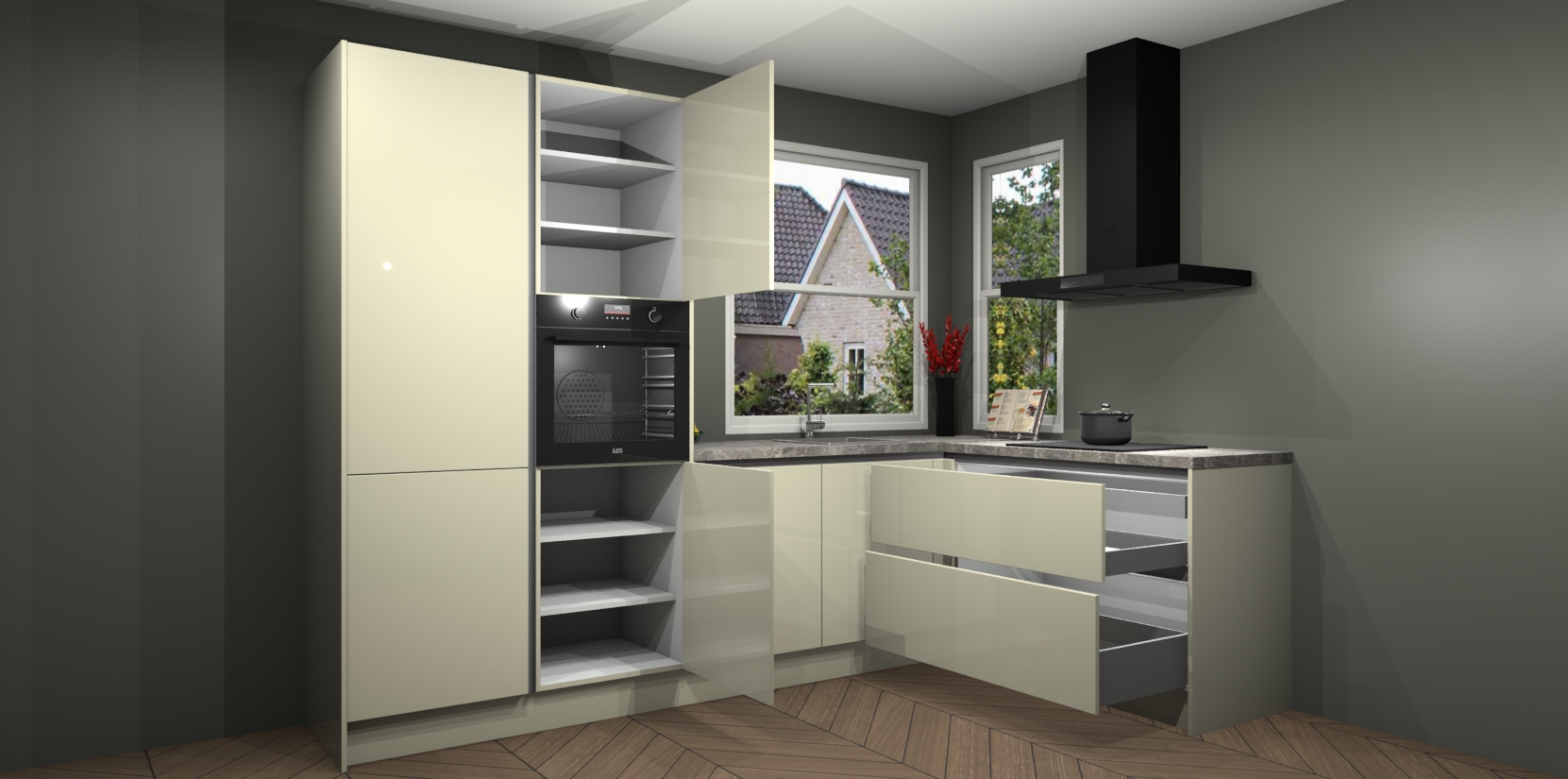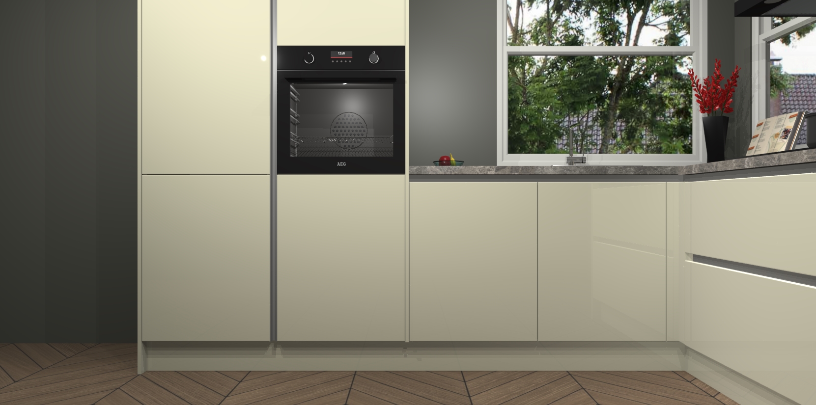 De Magnolia hoogglans greeploze keuken Kotor wordt geleverd met vijf inbouwapparaten, waaronder een oven, inductiekookplaat, afzuigkap, vaatwasser en koelkast. En als u uw apparatuur wilt upgraden, kunnen we u na bestelling eenvoudig helpen overstappen naar AEG. Bovendien heeft deze keuken soft close deuren, zodat lades en kastjes geruisloos en zonder klepperen sluiten!