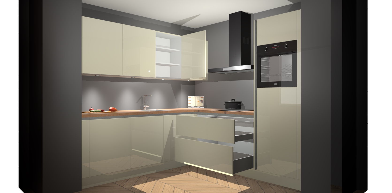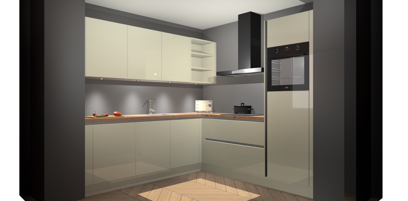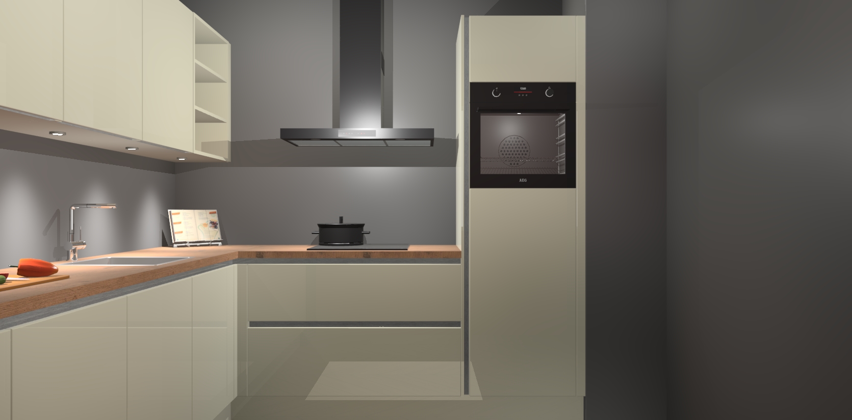 Met een modern, tijdloos design en ruime opslagruimte, zult u zich in no-time thuis voelen in uw nieuwe keuken. Uw leven wordt eenvoudiger met de soft-close deuren die voor het ultieme stille comfort zorgen - geen geluid dat u stoort terwijl u kookt. Ook is de keuken voorzien van 5 ingebouwde apparaten: een oven, inductie kookplaat, afzuigkap, vaatwasser en koelkast. Deze kunnen gemakkelijk na bestelling worden bijgewerkt naar AEG - waardoor uw luxe ervaring compleet is.