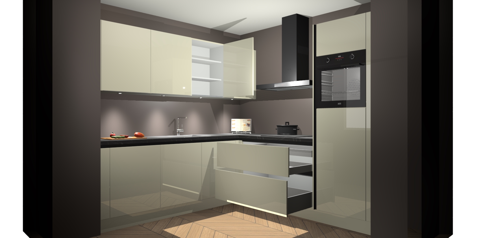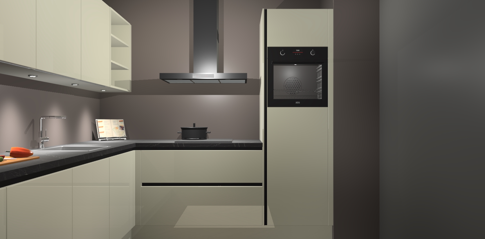 Met een modern, tijdloos design en ruime opslagruimte, zult u zich in no-time thuis voelen in uw nieuwe keuken. Uw leven wordt eenvoudiger met de soft-close deuren die voor het ultieme stille comfort zorgen - geen geluid dat u stoort terwijl u kookt. Ook is de keuken voorzien van 5 ingebouwde apparaten: een oven, inductie kookplaat, afzuigkap, vaatwasser en koelkast. Deze kunnen gemakkelijk na bestelling worden bijgewerkt naar AEG - waardoor uw luxe ervaring compleet is.