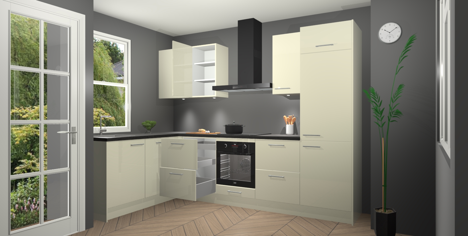 U hoeft zich ook geen zorgen te maken over een gebrek aan opbergruimte, want deze keuken heeft voldoende opbergmogelijkheden zowel boven als onder het aanrecht. Om het leven nog makkelijker te maken, wordt deze moderne hoekkeuken geleverd met 5 ingebouwde apparaten, waaronder een oven, inductiekookplaat, afzuigkap, vaatwasser en koelkast, zodat u in een mum van tijd klaar bent voor actie!