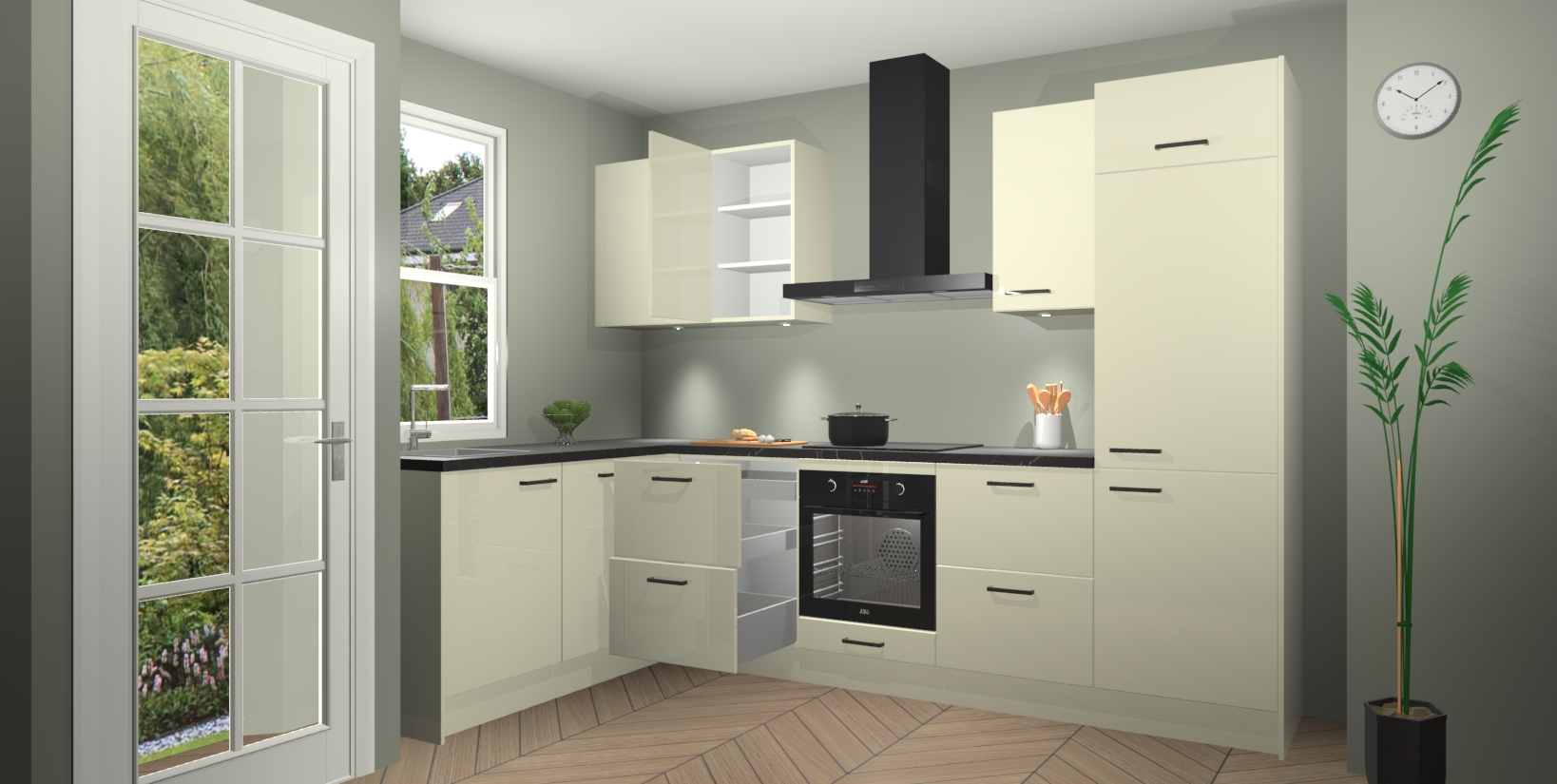 U hoeft zich ook geen zorgen te maken over een gebrek aan opbergruimte, want deze keuken heeft voldoende opbergmogelijkheden zowel boven als onder het aanrecht. Om het leven nog makkelijker te maken, wordt deze moderne hoekkeuken geleverd met 5 ingebouwde apparaten, waaronder een oven, inductiekookplaat, afzuigkap, vaatwasser en koelkast, zodat u in een mum van tijd klaar bent voor actie!