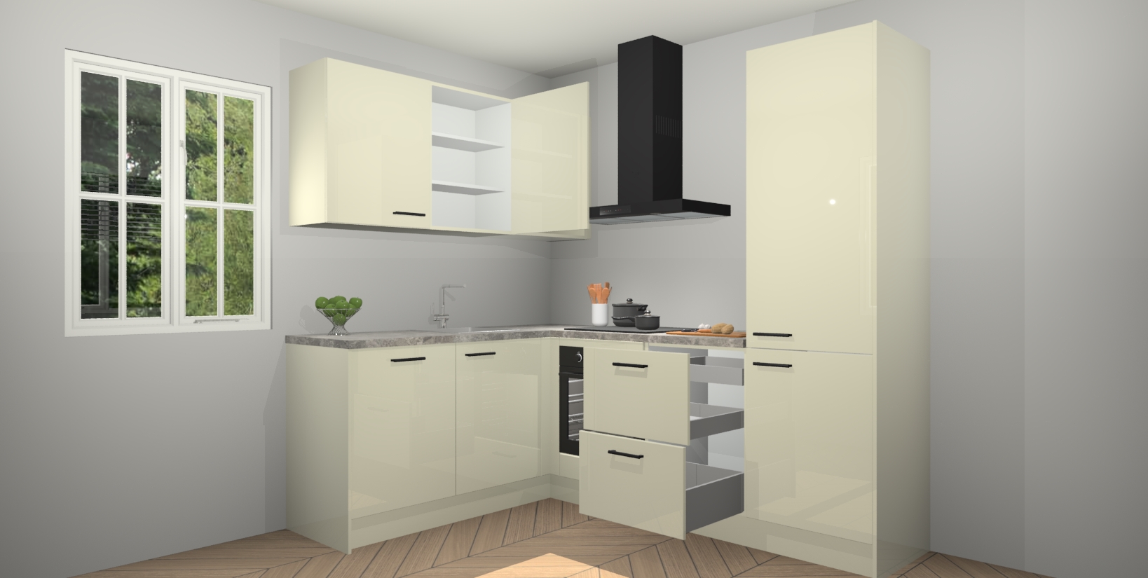 Voor nog meer gemak heeft deze keuken vijf ingebouwde apparaten - oven, inductiekookplaat, afzuigkap, vaatwasser en koelkast. Bovendien hebben alle kasten softclose deuren voor extra comfort bij het sluiten. Dit alles voor een verrassend lage vaste prijs - u vindt nergens anders een betere deal!