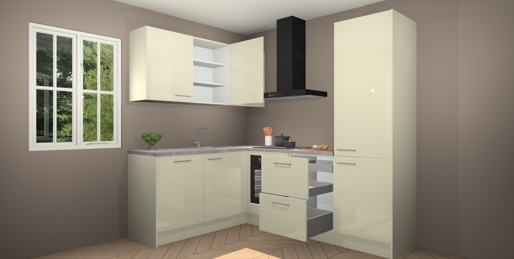 Voor nog meer gemak heeft deze keuken vijf ingebouwde apparaten - oven, inductiekookplaat, afzuigkap, vaatwasser en koelkast. Bovendien hebben alle kasten softclose deuren voor extra comfort bij het sluiten. Dit alles voor een verrassend lage vaste prijs - u vindt nergens anders een betere deal!