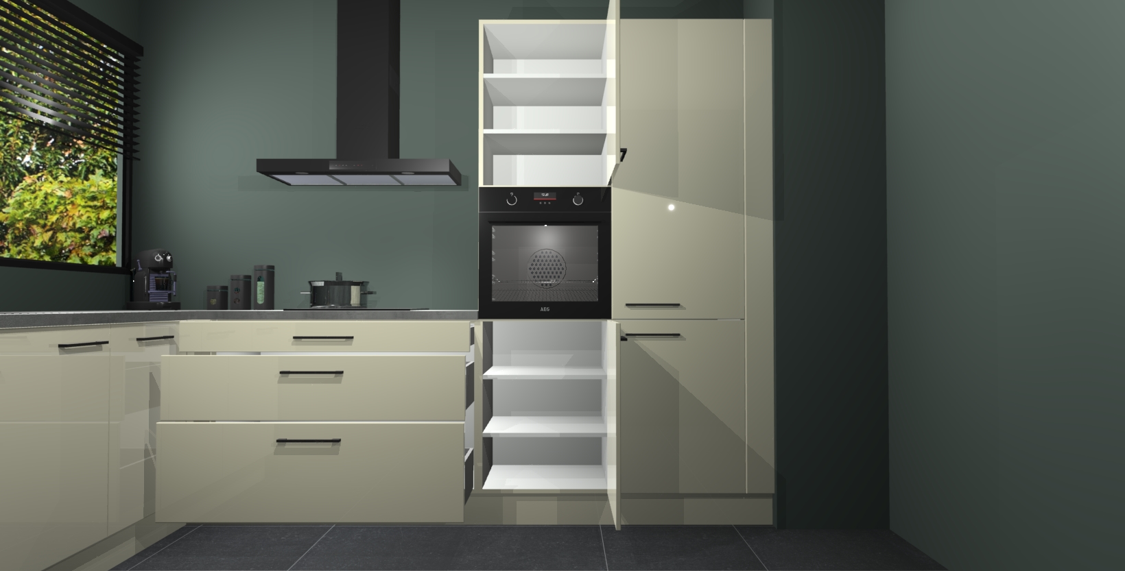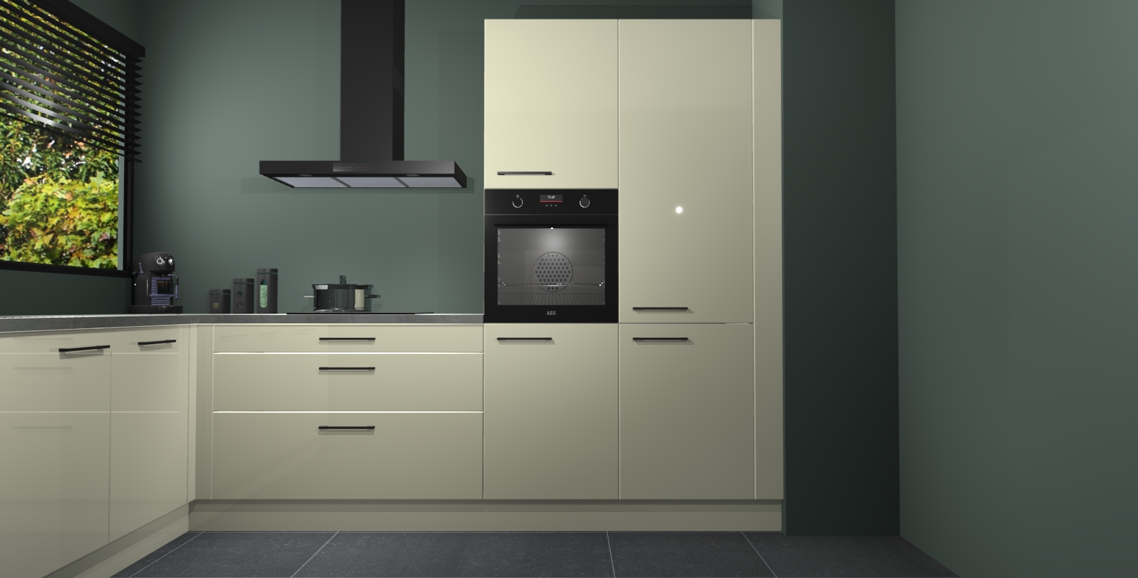 Met een modern, tijdloos design en ruime opslagruimte, zult u zich in no-time thuis voelen in uw nieuwe keuken. Uw leven wordt eenvoudiger met de soft-close deuren die voor het ultieme stille comfort zorgen - geen geluid dat u stoort terwijl u kookt. Ook is de keuken voorzien van 5 ingebouwde apparaten: een oven, inductie kookplaat, afzuigkap, vaatwasser en koelkast. Deze kunnen gemakkelijk na bestelling worden bijgewerkt naar AEG - waardoor uw luxe ervaring compleet is.
