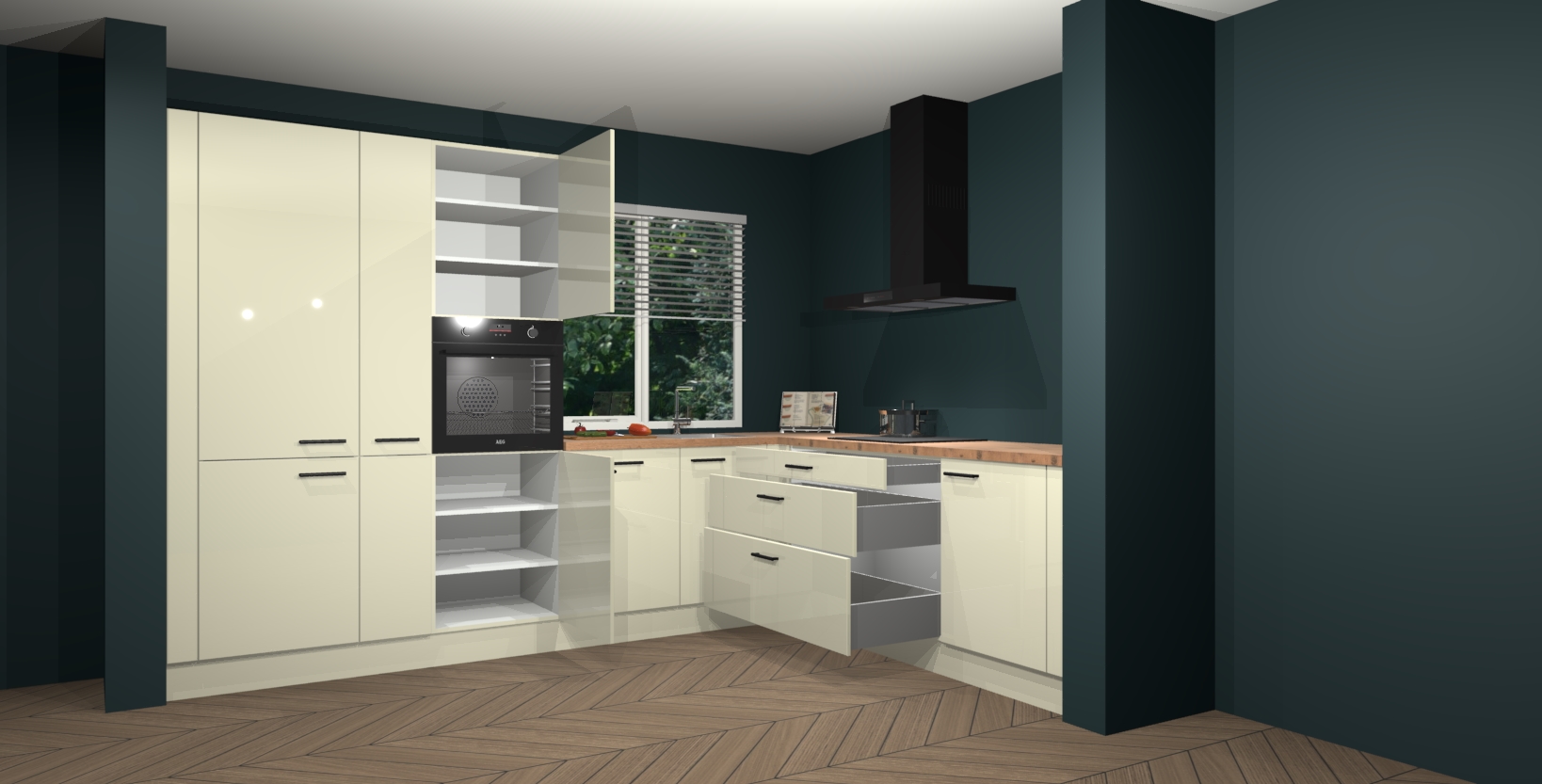 Met een modern, tijdloos design en ruime opslagruimte, zult u zich in no-time thuis voelen in uw nieuwe keuken. Uw leven wordt eenvoudiger met de soft-close deuren die voor het ultieme stille comfort zorgen - geen geluid dat u stoort terwijl u kookt. Ook is de keuken voorzien van 5 ingebouwde apparaten: een oven, inductie kookplaat, afzuigkap, vaatwasser en koelkast. Deze kunnen gemakkelijk na bestelling worden bijgewerkt naar AEG - waardoor uw luxe ervaring compleet is.
