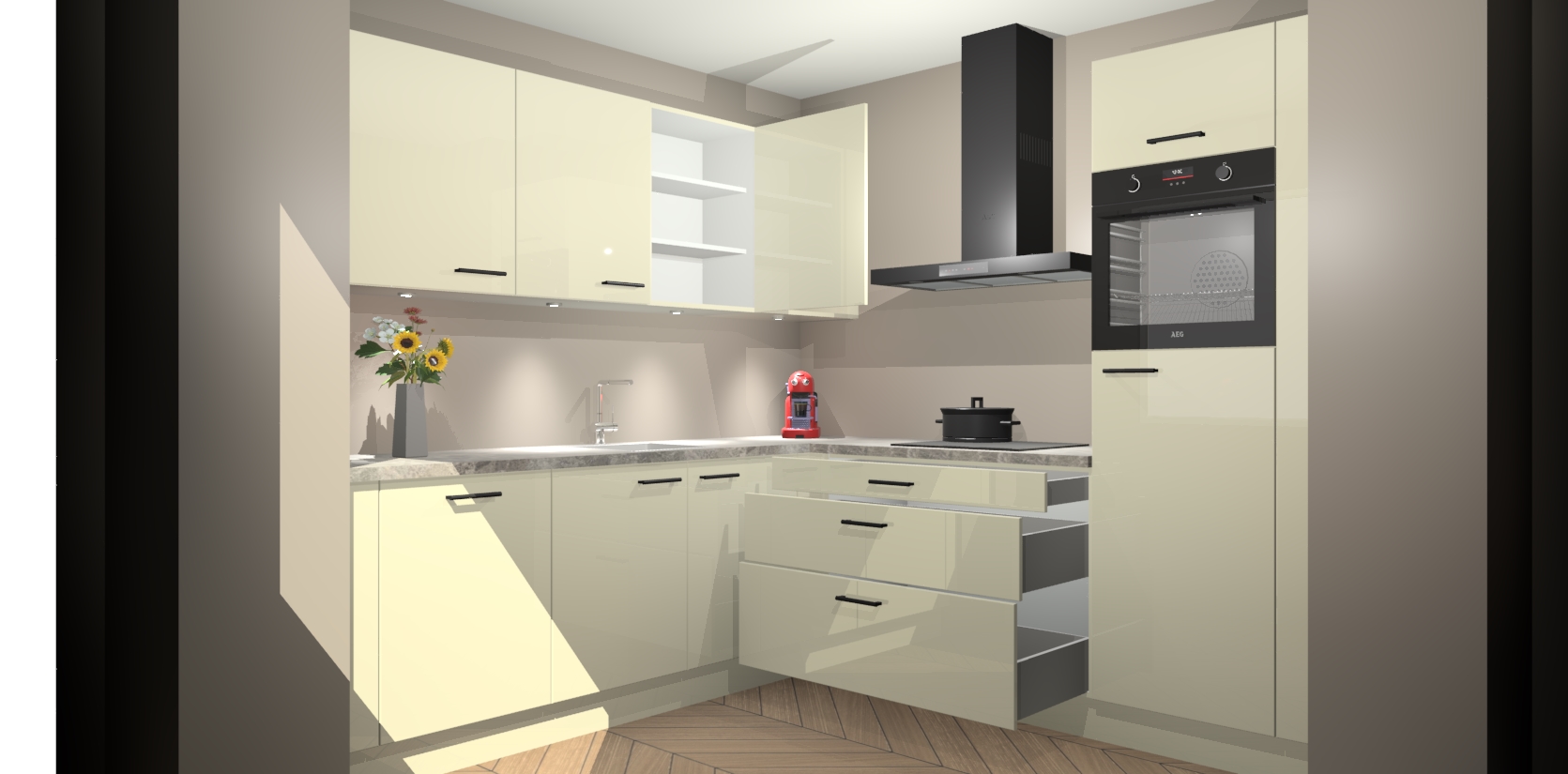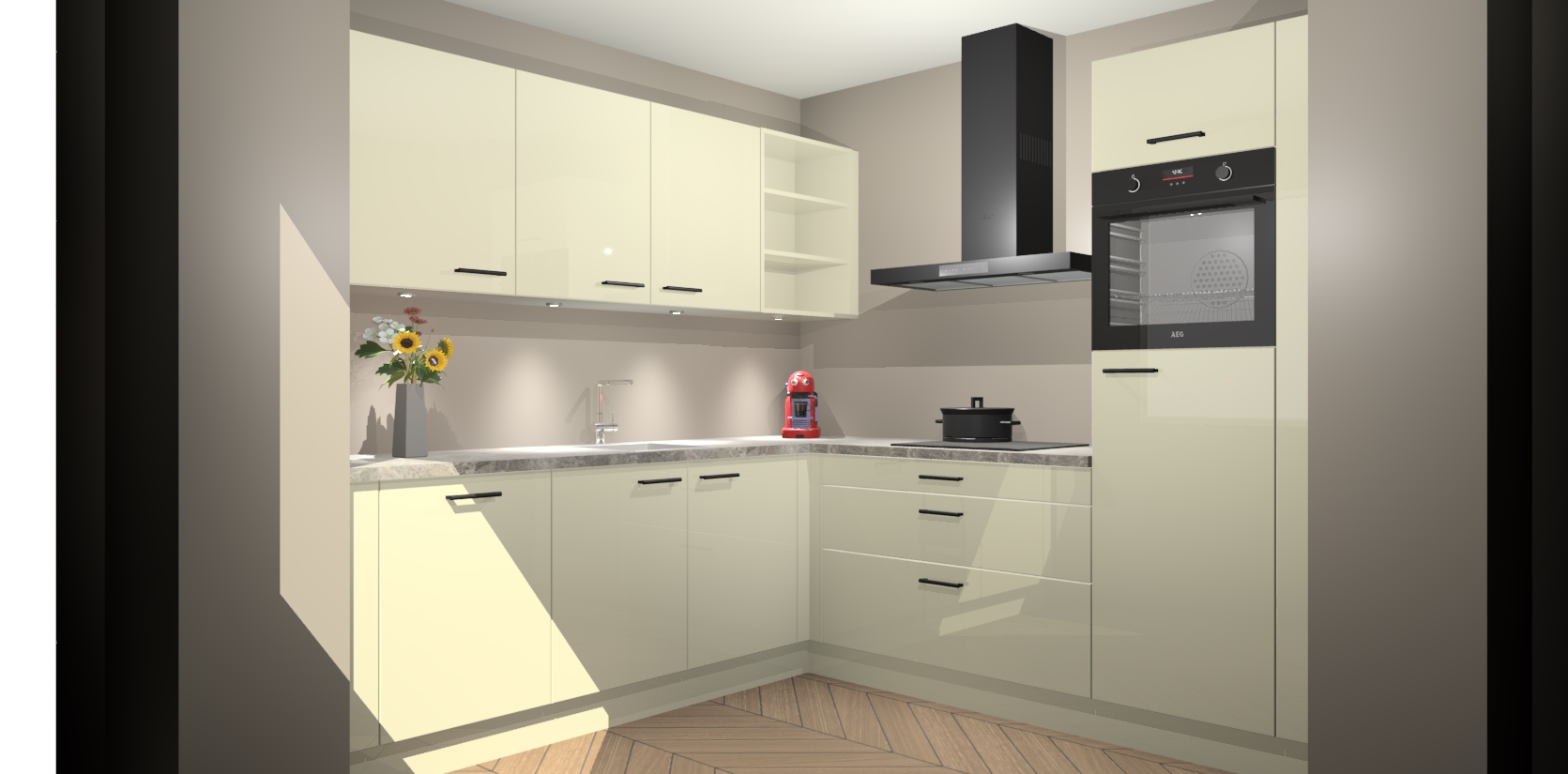 Met een modern, tijdloos design en ruime opslagruimte, zult u zich in no-time thuis voelen in uw nieuwe keuken. Uw leven wordt eenvoudiger met de soft-close deuren die voor het ultieme stille comfort zorgen - geen geluid dat u stoort terwijl u kookt. Ook is de keuken voorzien van 5 ingebouwde apparaten: een oven, inductie kookplaat, afzuigkap, vaatwasser en koelkast. Deze kunnen gemakkelijk na bestelling worden bijgewerkt naar AEG - waardoor uw luxe ervaring compleet is.