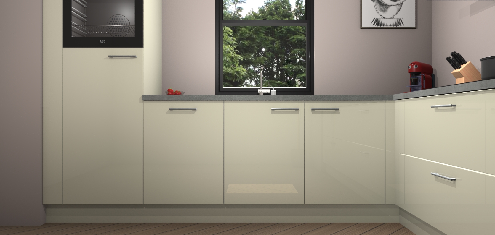 Welkom bij de magnolia hoogglans keuken Lublin. Deze prachtige keuken zal de komende jaren het middelpunt van de belangstelling in uw huis zijn. Uitgerust met vijf inbouwapparaten komt u nooit kookgereedschap tekort. Bovendien geeft de warme houtlook elke ruimte een uitnodigende en tijdloze uitstraling.