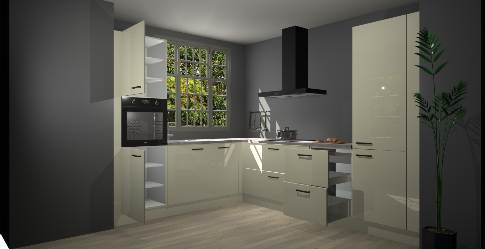 Met een modern, tijdloos design en ruime opslagruimte, zult u zich in no-time thuis voelen in uw nieuwe keuken. Uw leven wordt eenvoudiger met de soft-close deuren die voor het ultieme stille comfort zorgen - geen geluid dat u stoort terwijl u kookt. Ook is de keuken voorzien van 5 ingebouwde apparaten: een oven, inductie kookplaat, afzuigkap, vaatwasser en koelkast. Deze kunnen gemakkelijk na bestelling worden bijgewerkt naar AEG - waardoor uw luxe ervaring compleet is.