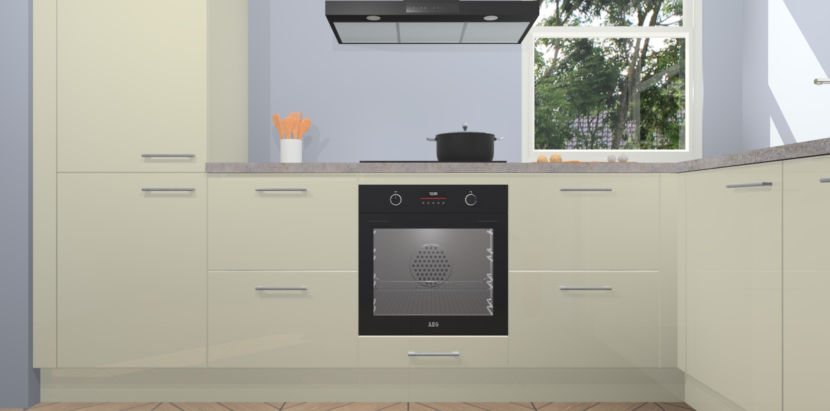 Wat maakt deze keuken zo bijzonder? Ten eerste geeft het houten werkblad uw ruimte een onmiskenbaar klassieke uitstraling. De natuurlijke afwerking roept warmte en elegantie op die nooit uit de mode zullen raken. Bovendien is het gemakkelijk schoon te houden en te onderhouden, zodat je er jarenlang plezier van kunt hebben. Als u op zoek bent naar extra gemak in uw keuken, dan heeft u bij het plaatsen van een bestelling bij ons ook de optie om uw toestellen te upgraden naar AEG-modellen - zo haalt u moderne innovatie van topmerken in apparatentechnologie rechtstreeks in huis.