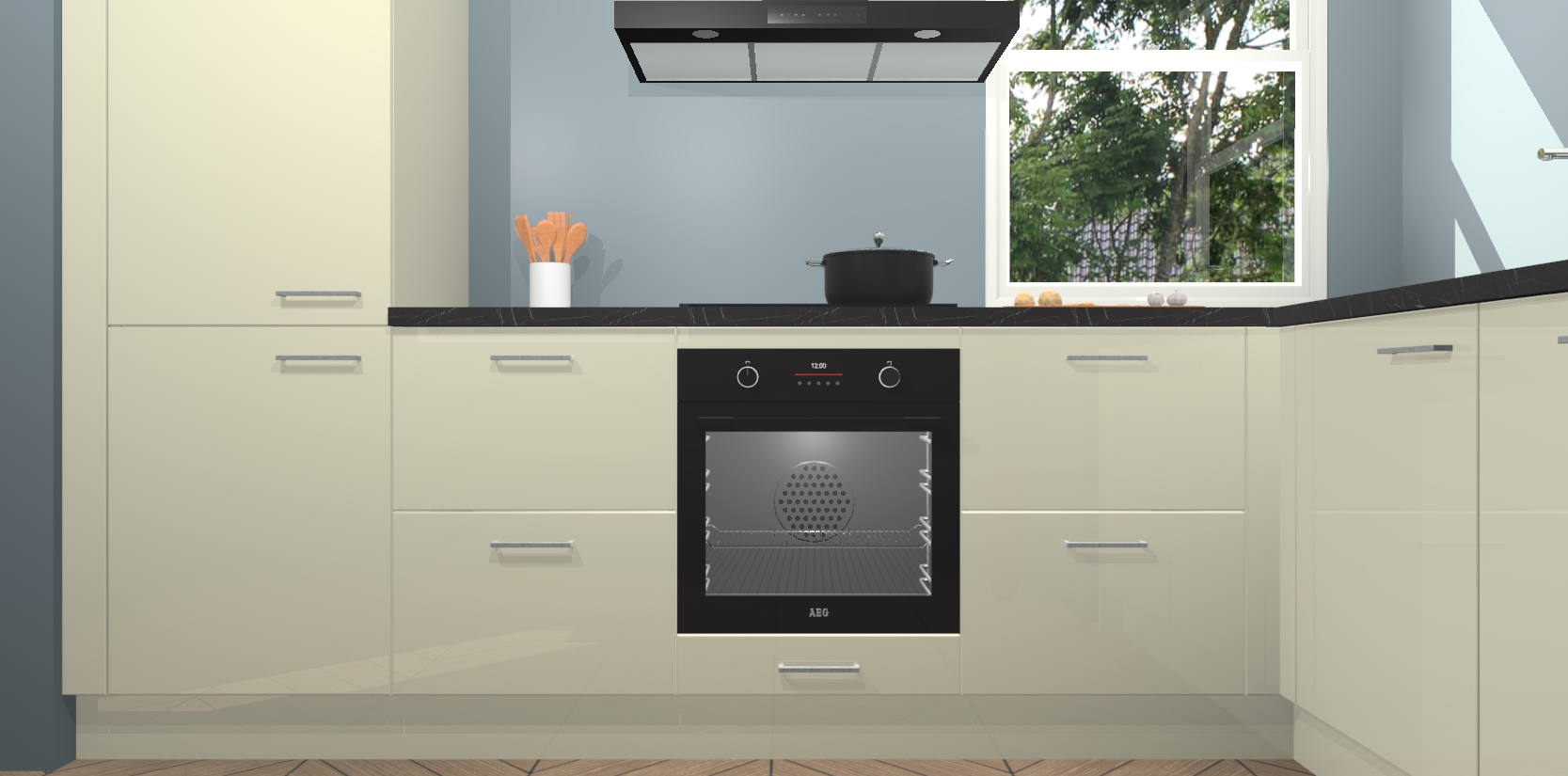 Wat maakt deze keuken zo bijzonder? Ten eerste geeft het houten werkblad uw ruimte een onmiskenbaar klassieke uitstraling. De natuurlijke afwerking roept warmte en elegantie op die nooit uit de mode zullen raken. Bovendien is het gemakkelijk schoon te houden en te onderhouden, zodat je er jarenlang plezier van kunt hebben. Als u op zoek bent naar extra gemak in uw keuken, dan heeft u bij het plaatsen van een bestelling bij ons ook de optie om uw toestellen te upgraden naar AEG-modellen - zo haalt u moderne innovatie van topmerken in apparatentechnologie rechtstreeks in huis.