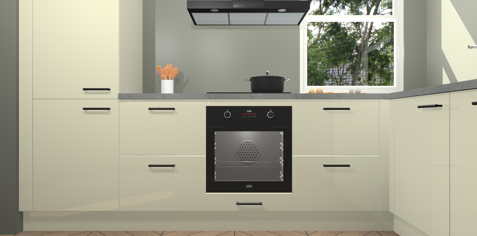 Wat maakt deze keuken zo bijzonder? Ten eerste geeft het houten werkblad uw ruimte een onmiskenbaar klassieke uitstraling. De natuurlijke afwerking roept warmte en elegantie op die nooit uit de mode zullen raken. Bovendien is het gemakkelijk schoon te houden en te onderhouden, zodat je er jarenlang plezier van kunt hebben. Als u op zoek bent naar extra gemak in uw keuken, dan heeft u bij het plaatsen van een bestelling bij ons ook de optie om uw toestellen te upgraden naar AEG-modellen - zo haalt u moderne innovatie van topmerken in apparatentechnologie rechtstreeks in huis.
