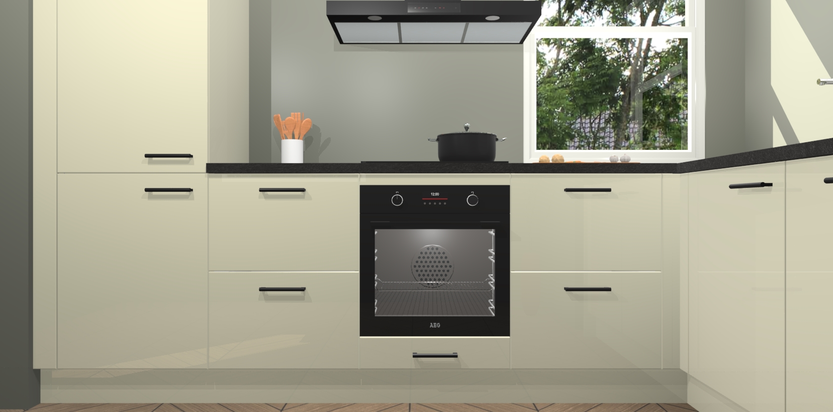 Wat maakt deze keuken zo bijzonder? Ten eerste geeft het houten werkblad uw ruimte een onmiskenbaar klassieke uitstraling. De natuurlijke afwerking roept warmte en elegantie op die nooit uit de mode zullen raken. Bovendien is het gemakkelijk schoon te houden en te onderhouden, zodat je er jarenlang plezier van kunt hebben. Als u op zoek bent naar extra gemak in uw keuken, dan heeft u bij het plaatsen van een bestelling bij ons ook de optie om uw toestellen te upgraden naar AEG-modellen - zo haalt u moderne innovatie van topmerken in apparatentechnologie rechtstreeks in huis.