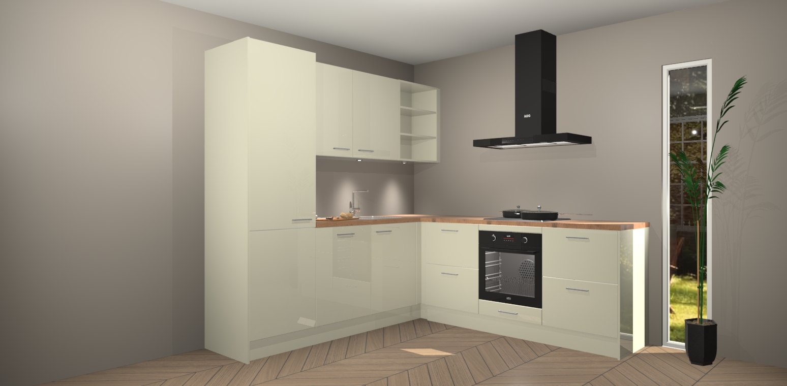 Met zijn moderne design en aantrekkelijke hoekopstelling biedt deze keuken een unieke look die zelfs de meest veeleisende huiseigenaar zal bevallen. En omdat de binnenkant van de kasten dezelfde kleur heeft als de buitenkant, heeft uw keuken een consistente afwerking. Bovenop de geweldige look is opbergruimte ook geen probleem, met voldoende kast- en laderuimte achter zelfs de mooiste buitenkant.
