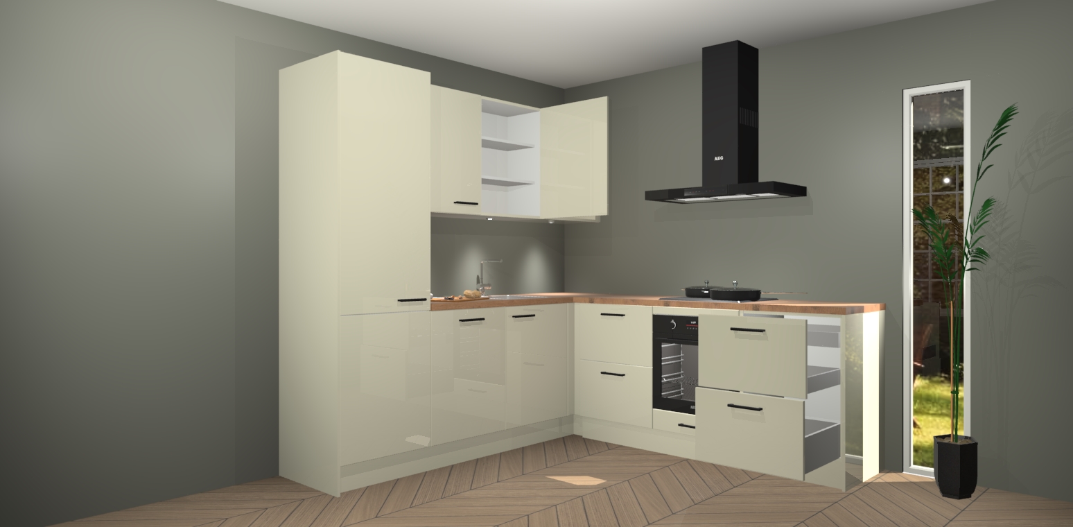 Met zijn moderne design en aantrekkelijke hoekopstelling biedt deze keuken een unieke look die zelfs de meest veeleisende huiseigenaar zal bevallen. En omdat de binnenkant van de kasten dezelfde kleur heeft als de buitenkant, heeft uw keuken een consistente afwerking. Bovenop de geweldige look is opbergruimte ook geen probleem, met voldoende kast- en laderuimte achter zelfs de mooiste buitenkant.