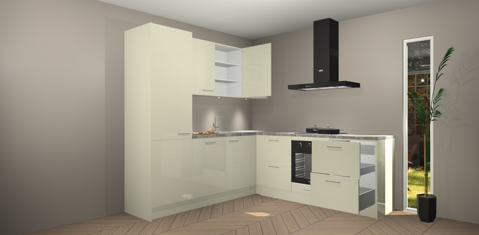 Met zijn moderne design en aantrekkelijke hoekopstelling biedt deze keuken een unieke look die zelfs de meest veeleisende huiseigenaar zal bevallen. En omdat de binnenkant van de kasten dezelfde kleur heeft als de buitenkant, heeft uw keuken een consistente afwerking. Bovenop de geweldige look is opbergruimte ook geen probleem, met voldoende kast- en laderuimte achter zelfs de mooiste buitenkant.