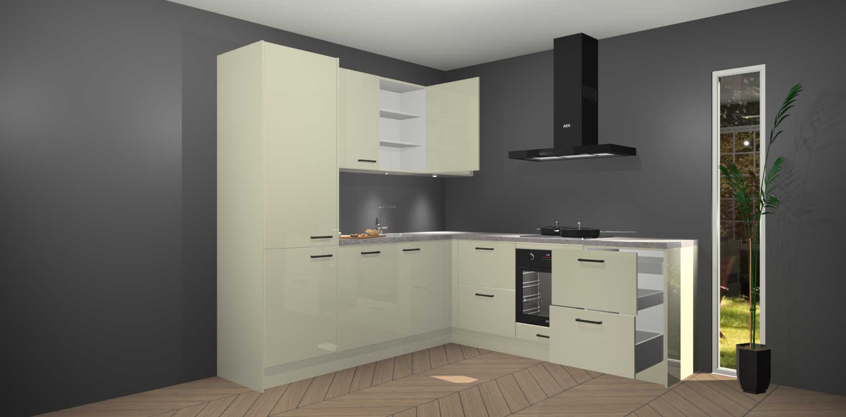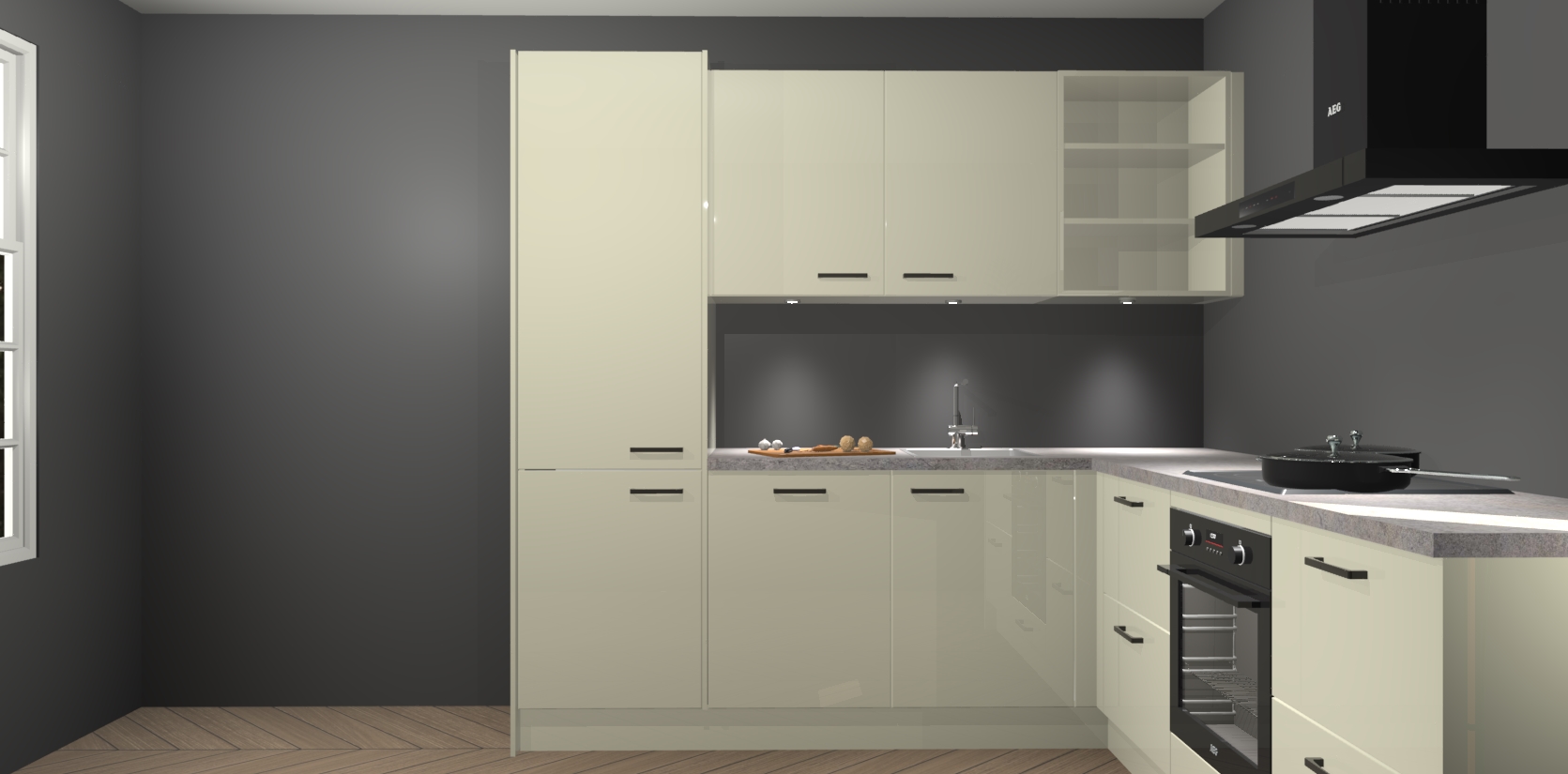 Met zijn moderne design en aantrekkelijke hoekopstelling biedt deze keuken een unieke look die zelfs de meest veeleisende huiseigenaar zal bevallen. En omdat de binnenkant van de kasten dezelfde kleur heeft als de buitenkant, heeft uw keuken een consistente afwerking. Bovenop de geweldige look is opbergruimte ook geen probleem, met voldoende kast- en laderuimte achter zelfs de mooiste buitenkant.