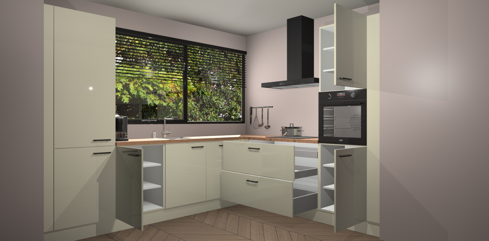 Met een modern, tijdloos design en ruime opslagruimte, zult u zich in no-time thuis voelen in uw nieuwe keuken. Uw leven wordt eenvoudiger met de soft-close deuren die voor het ultieme stille comfort zorgen - geen geluid dat u stoort terwijl u kookt. Ook is de keuken voorzien van 5 ingebouwde apparaten: een oven, inductie kookplaat, afzuigkap, vaatwasser en koelkast. Deze kunnen gemakkelijk na bestelling worden bijgewerkt naar AEG - waardoor uw luxe ervaring compleet is.
