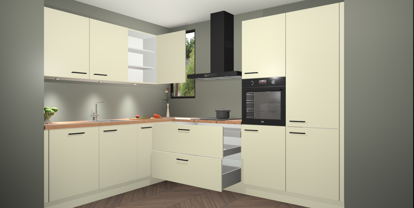 De ruime opbergruimte van dit model maakt het bereiden van voedsel en het gebruik van apparaten snel en gemakkelijk. Het beste van alles is dat het wordt geleverd met vijf inbouwapparaten: een oven, inductiekookplaat, afzuigkap, vaatwasser en koelkast - die allemaal gemakkelijk kunnen worden opgewaardeerd naar AEG na aankoop. Wat de gemaksfactor nog groter maakt, is het feit dat alle cabines voorgemonteerd worden geleverd, zodat u er meteen mee aan de slag kunt!