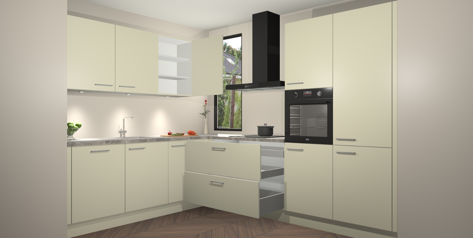 De ruime opbergruimte van dit model maakt het bereiden van voedsel en het gebruik van apparaten snel en gemakkelijk. Het beste van alles is dat het wordt geleverd met vijf inbouwapparaten: een oven, inductiekookplaat, afzuigkap, vaatwasser en koelkast - die allemaal gemakkelijk kunnen worden opgewaardeerd naar AEG na aankoop. Wat de gemaksfactor nog groter maakt, is het feit dat alle cabines voorgemonteerd worden geleverd, zodat u er meteen mee aan de slag kunt!