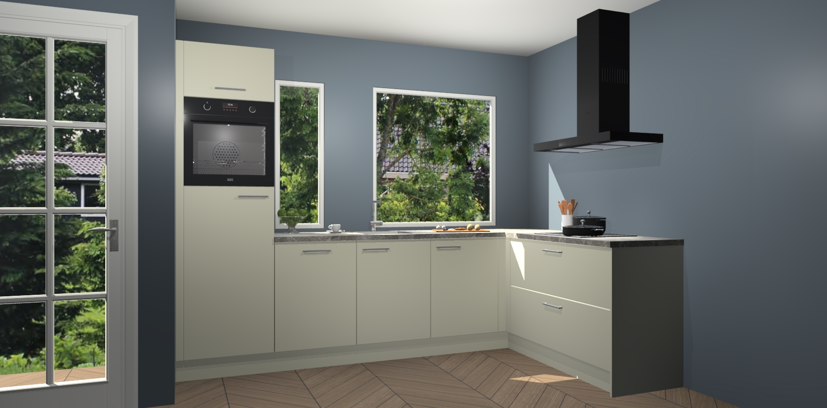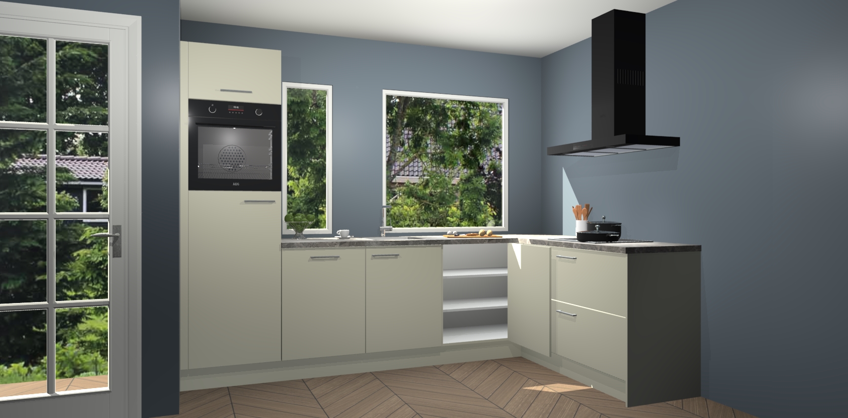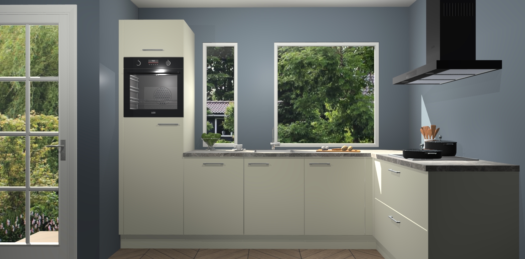 Deze complete keuken wordt geleverd met 5 inbouwapparaten: een oven, inductiekookplaat, afzuigkap, vaatwasser en koelkast.  De toestellen kunnen na bestelling ook gemakkelijk worden opgewaardeerd naar AEG. Bovendien is elke deur in deze keuken voorzien van handige softclose technologie voor eenvoudig gebruik! Als een leuke toevoeging zit in deze keuken ook een carrousel, zo hoef je niet meer de hoek in duiken om iets te pakken.