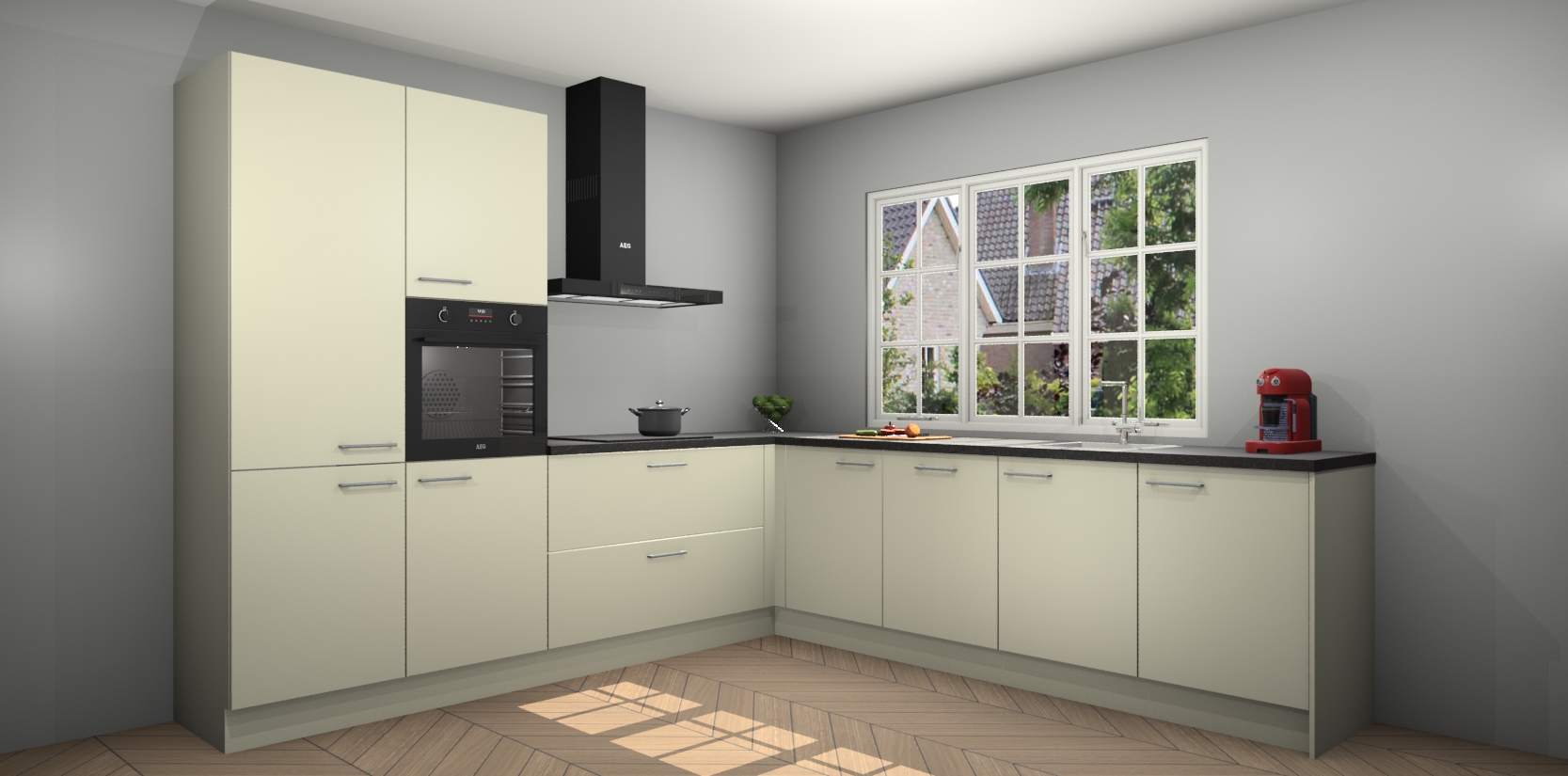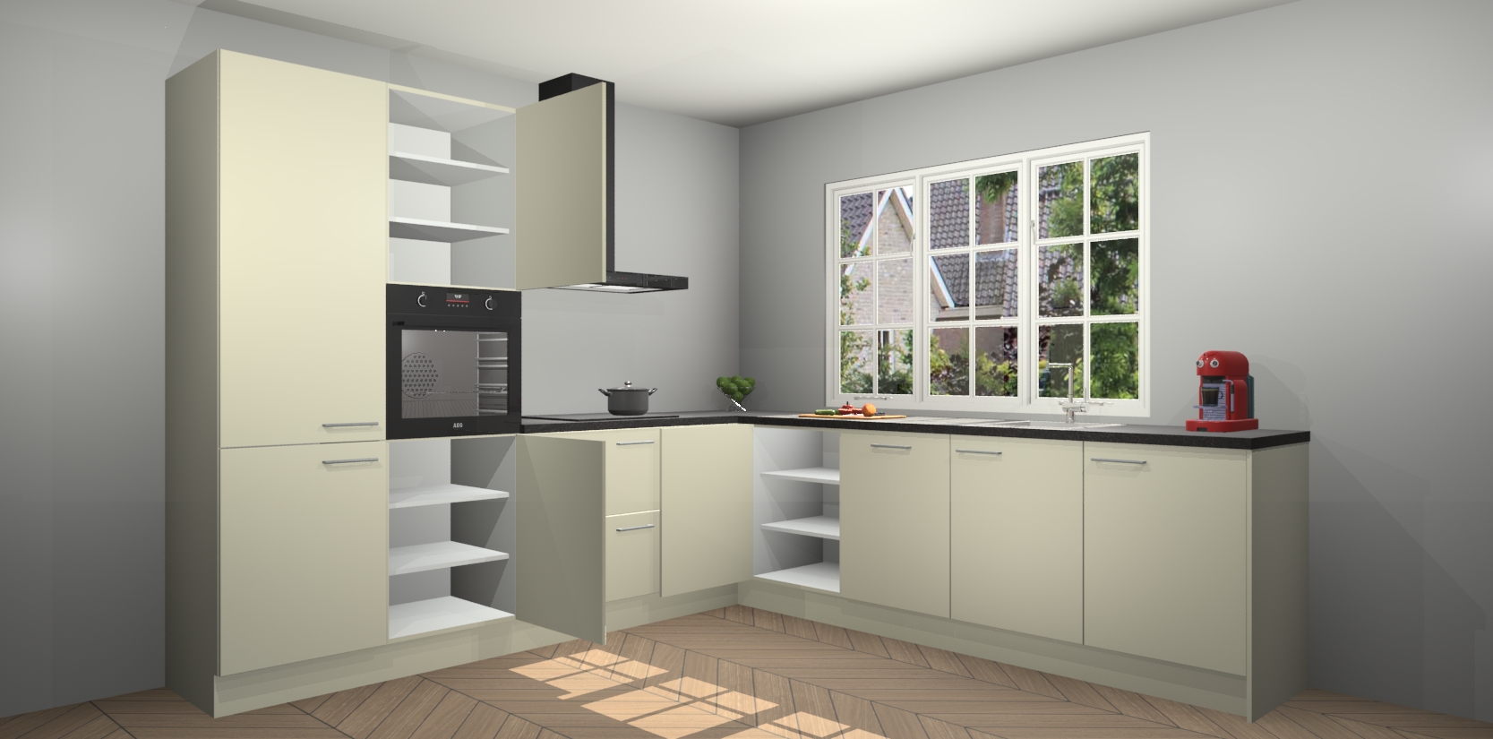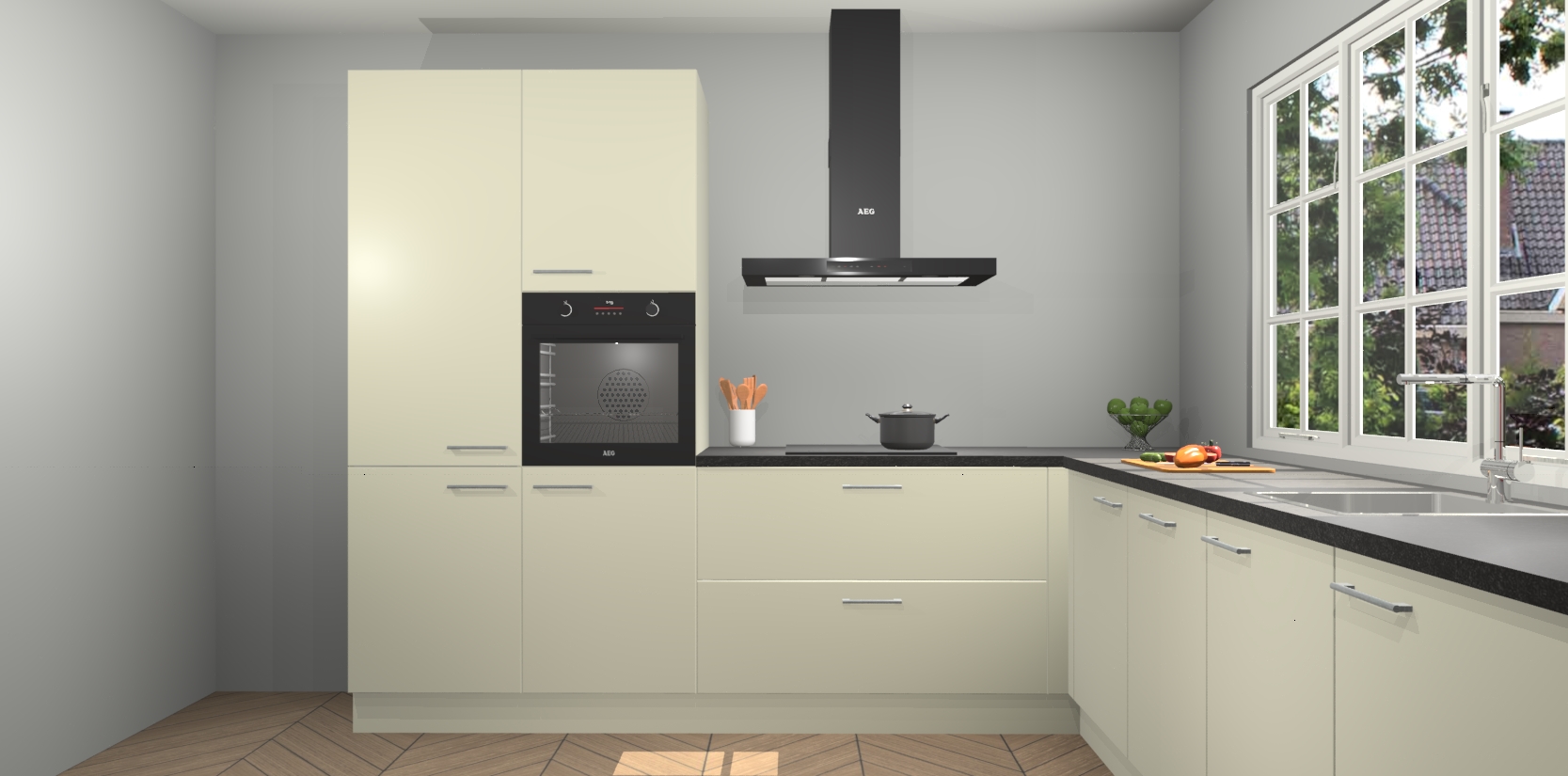 De keuken heeft veel opbergruimte, waardoor u alle ingrediënten gemakkelijk bereikbaar hebt staan. En daarnaast bevat deze volledig uitgeruste keuken ook 5 ingebouwde apparaten: een oven, inductiekookplaat, afzuigkap, vaatwasser en koelkast. Deze zijn heel eenvoudig na bestellen te upgraden naar AEG als u dit wilt. Bovendien zijn de softclose-kastdeuren ideaal; geef ze gewoon even een tikje en ze sluiten automatisch met geruisloze precisie.