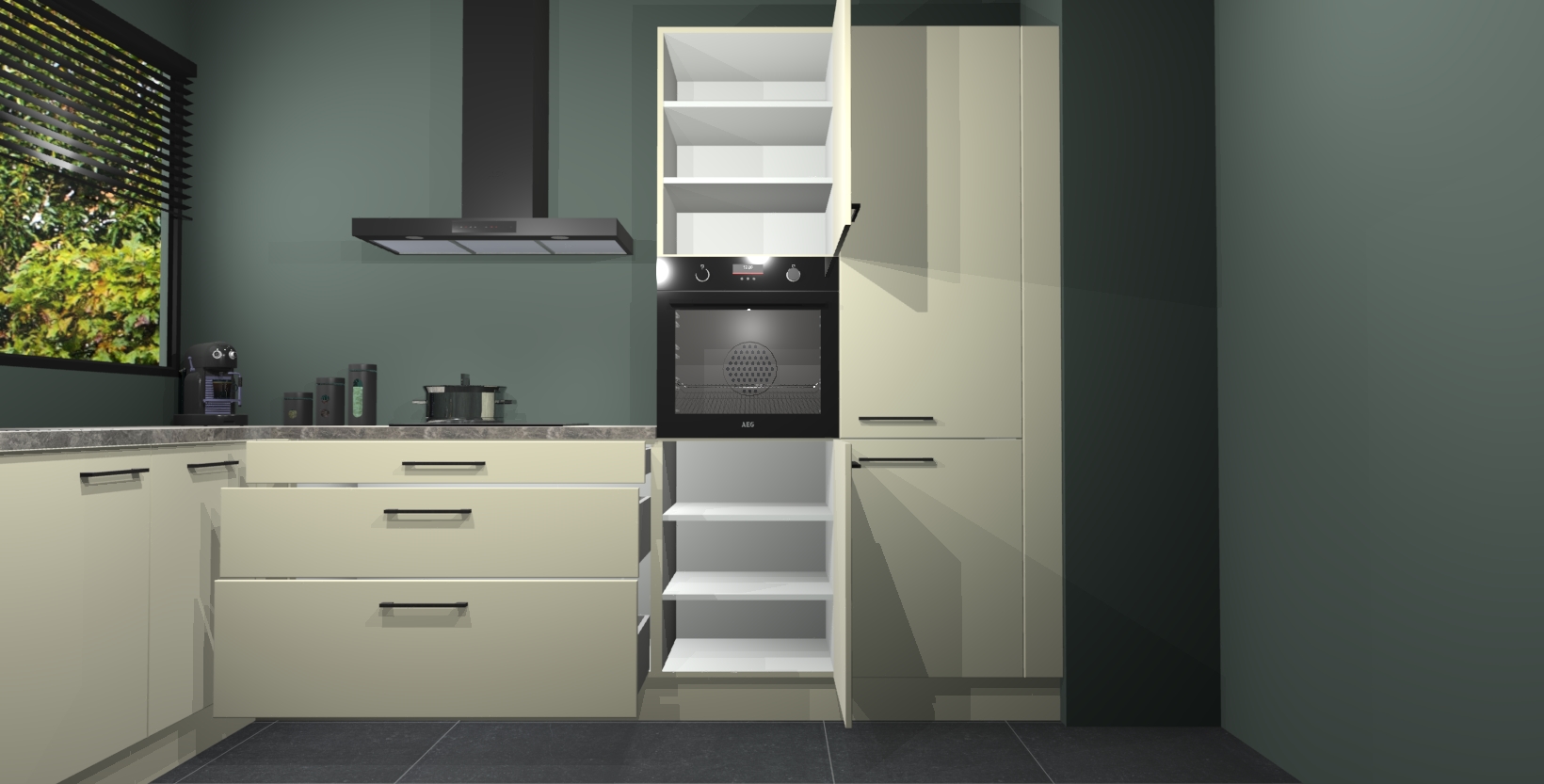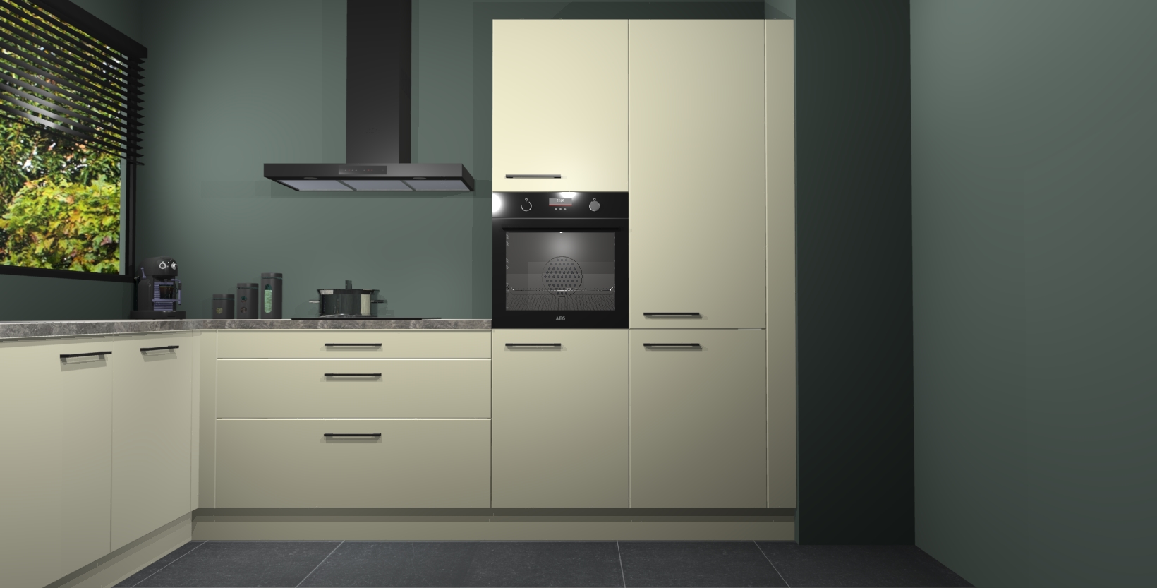 Met een modern, tijdloos design en ruime opslagruimte, zult u zich in no-time thuis voelen in uw nieuwe keuken. Uw leven wordt eenvoudiger met de soft-close deuren die voor het ultieme stille comfort zorgen - geen geluid dat u stoort terwijl u kookt. Ook is de keuken voorzien van 5 ingebouwde apparaten: een oven, inductie kookplaat, afzuigkap, vaatwasser en koelkast. Deze kunnen gemakkelijk na bestelling worden bijgewerkt naar AEG - waardoor uw luxe ervaring compleet is.