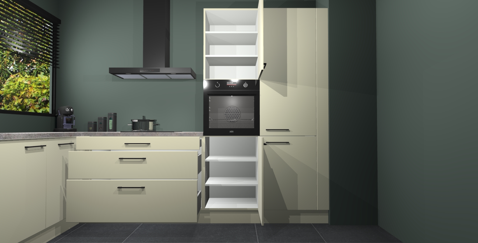 Met een modern, tijdloos design en ruime opslagruimte, zult u zich in no-time thuis voelen in uw nieuwe keuken. Uw leven wordt eenvoudiger met de soft-close deuren die voor het ultieme stille comfort zorgen - geen geluid dat u stoort terwijl u kookt. Ook is de keuken voorzien van 5 ingebouwde apparaten: een oven, inductie kookplaat, afzuigkap, vaatwasser en koelkast. Deze kunnen gemakkelijk na bestelling worden bijgewerkt naar AEG - waardoor uw luxe ervaring compleet is.