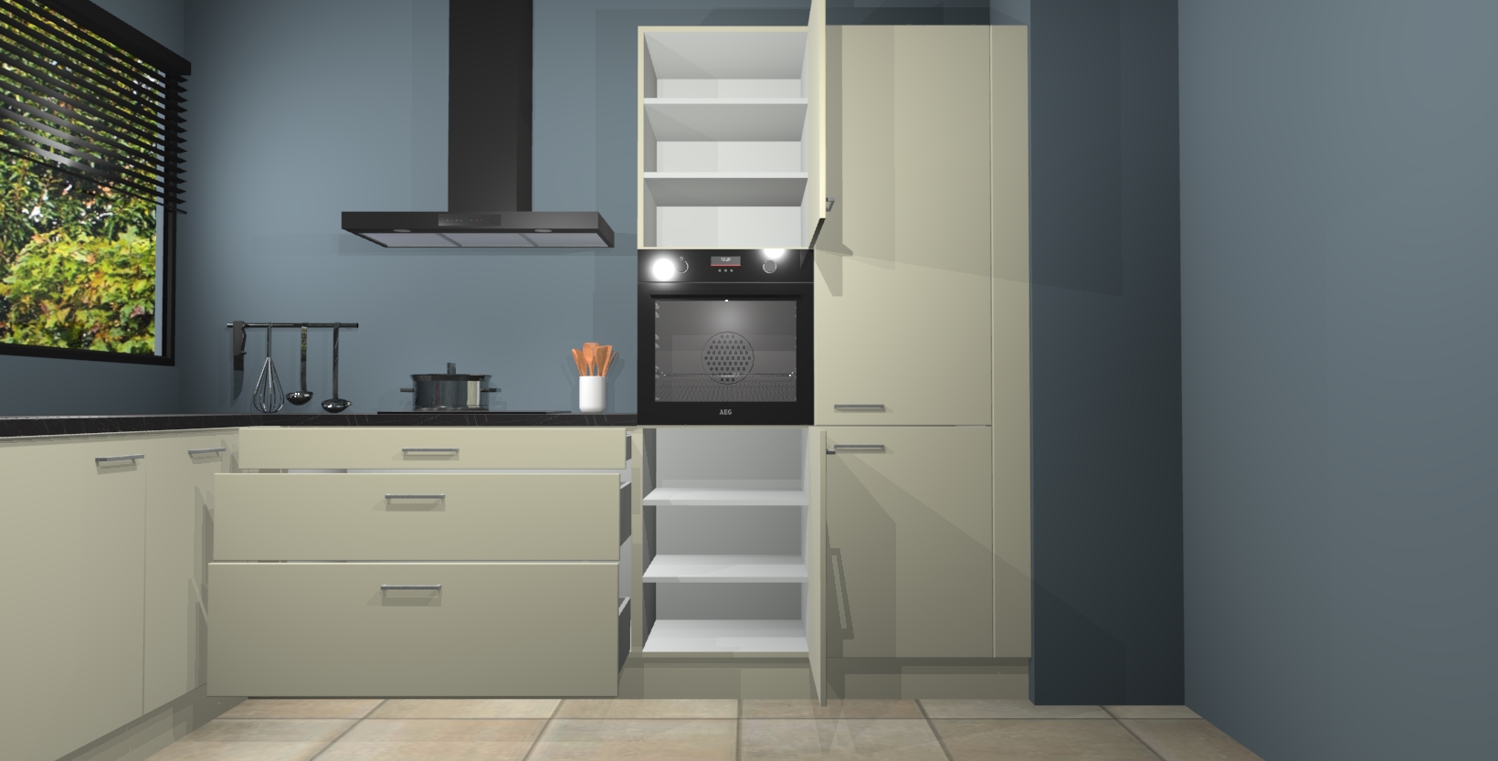 Met een modern, tijdloos design en ruime opslagruimte, zult u zich in no-time thuis voelen in uw nieuwe keuken. Uw leven wordt eenvoudiger met de soft-close deuren die voor het ultieme stille comfort zorgen - geen geluid dat u stoort terwijl u kookt. Ook is de keuken voorzien van 5 ingebouwde apparaten: een oven, inductie kookplaat, afzuigkap, vaatwasser en koelkast. Deze kunnen gemakkelijk na bestelling worden bijgewerkt naar AEG - waardoor uw luxe ervaring compleet is.