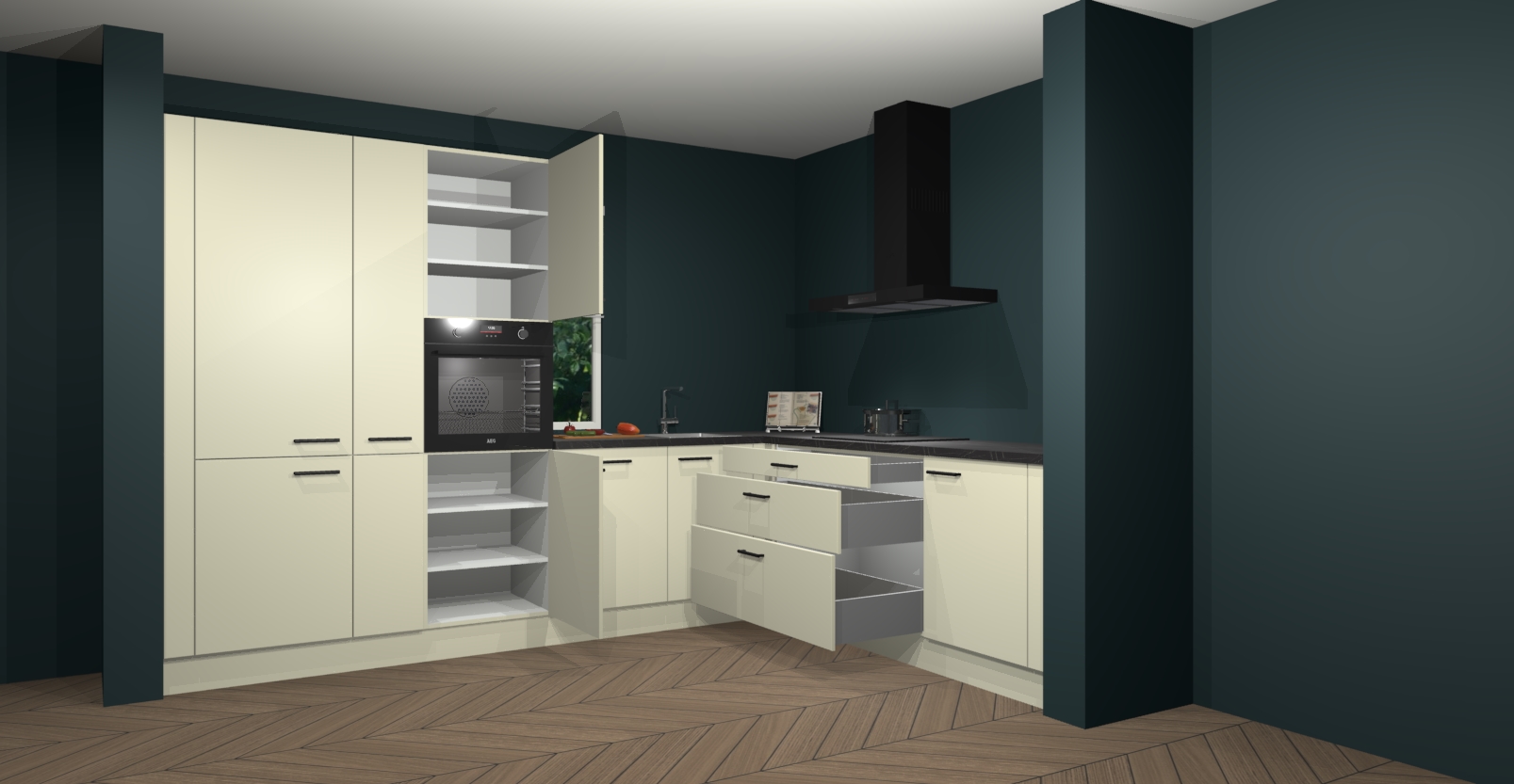 Met een modern, tijdloos design en ruime opslagruimte, zult u zich in no-time thuis voelen in uw nieuwe keuken. Uw leven wordt eenvoudiger met de soft-close deuren die voor het ultieme stille comfort zorgen - geen geluid dat u stoort terwijl u kookt. Ook is de keuken voorzien van 5 ingebouwde apparaten: een oven, inductie kookplaat, afzuigkap, vaatwasser en koelkast. Deze kunnen gemakkelijk na bestelling worden bijgewerkt naar AEG - waardoor uw luxe ervaring compleet is.
