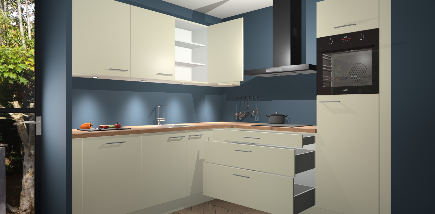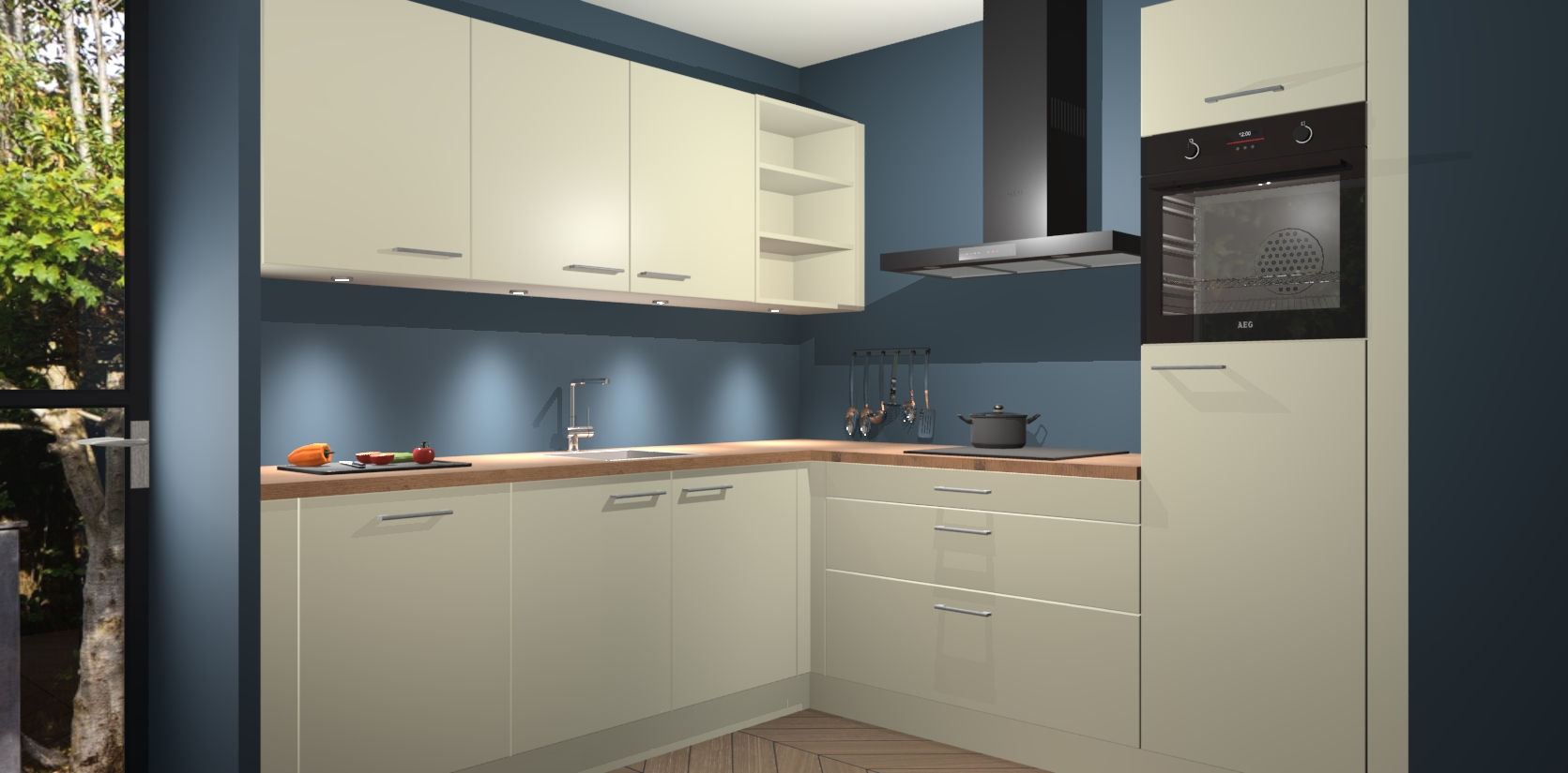 Met een modern, tijdloos design en ruime opslagruimte, zult u zich in no-time thuis voelen in uw nieuwe keuken. Uw leven wordt eenvoudiger met de soft-close deuren die voor het ultieme stille comfort zorgen - geen geluid dat u stoort terwijl u kookt. Ook is de keuken voorzien van 5 ingebouwde apparaten: een oven, inductie kookplaat, afzuigkap, vaatwasser en koelkast. Deze kunnen gemakkelijk na bestelling worden bijgewerkt naar AEG - waardoor uw luxe ervaring compleet is.