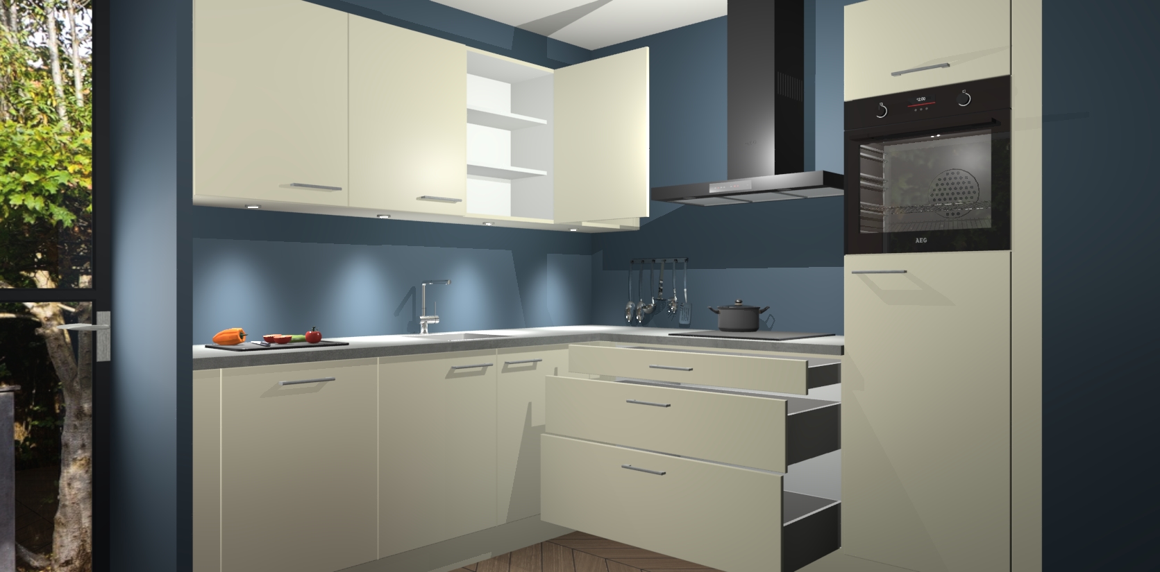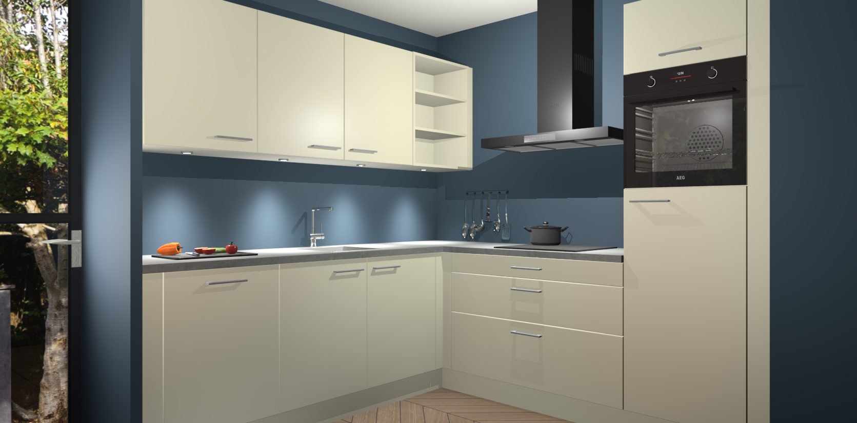 Met een modern, tijdloos design en ruime opslagruimte, zult u zich in no-time thuis voelen in uw nieuwe keuken. Uw leven wordt eenvoudiger met de soft-close deuren die voor het ultieme stille comfort zorgen - geen geluid dat u stoort terwijl u kookt. Ook is de keuken voorzien van 5 ingebouwde apparaten: een oven, inductie kookplaat, afzuigkap, vaatwasser en koelkast. Deze kunnen gemakkelijk na bestelling worden bijgewerkt naar AEG - waardoor uw luxe ervaring compleet is.